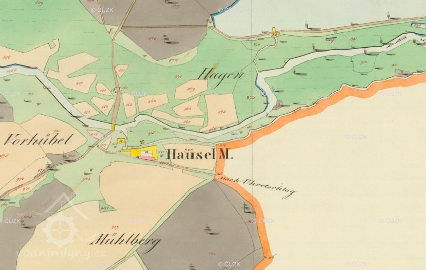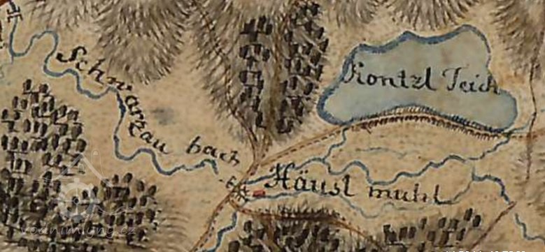 Mlýn prvně zobrazován na mapách I. vojenského mapování. (JV)