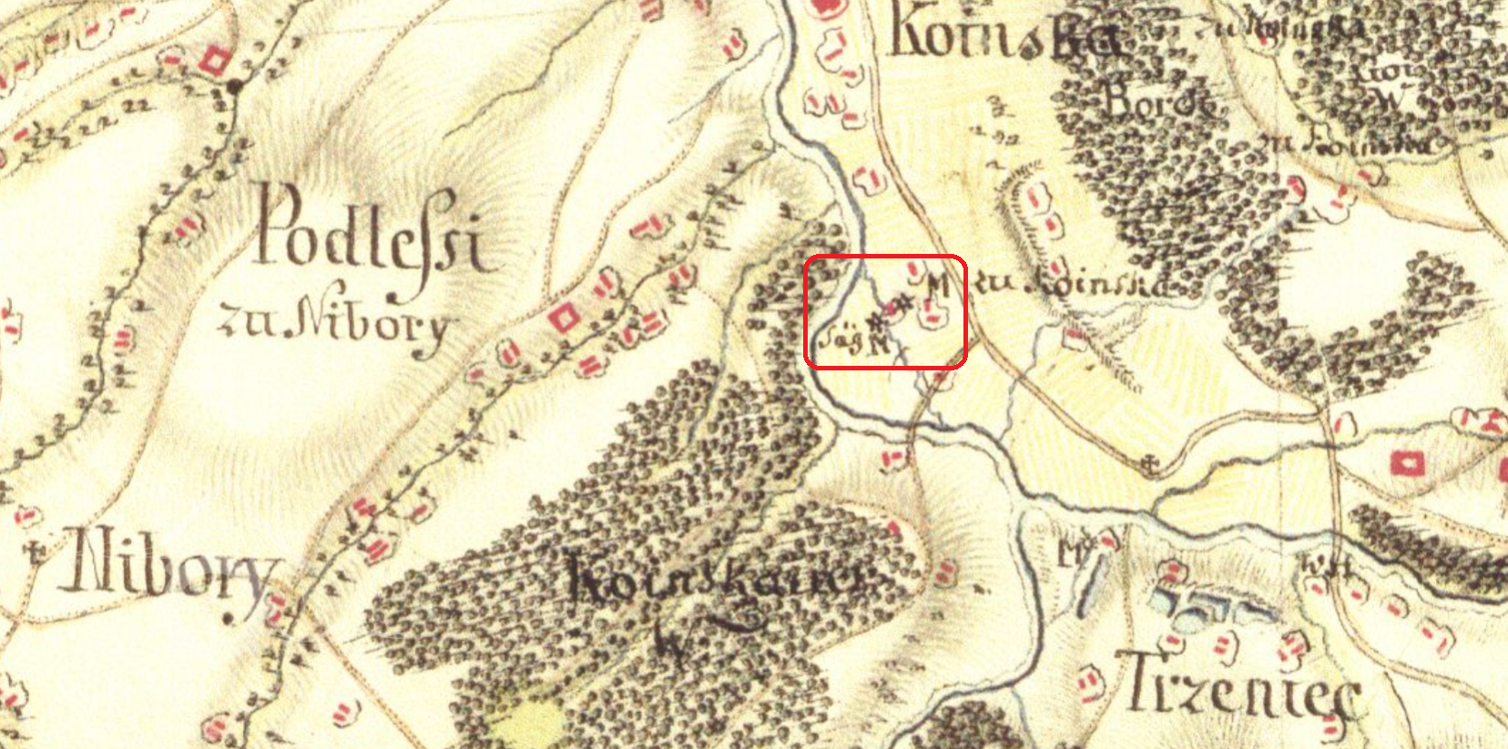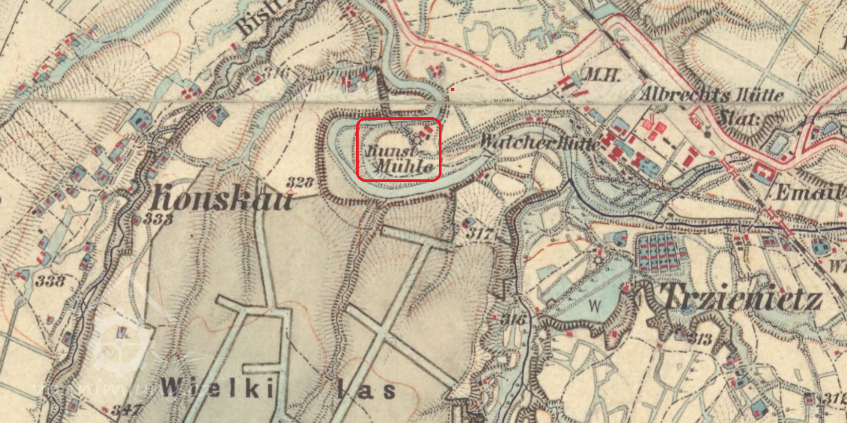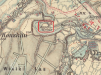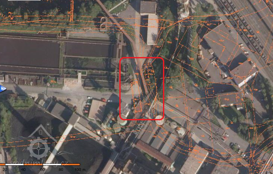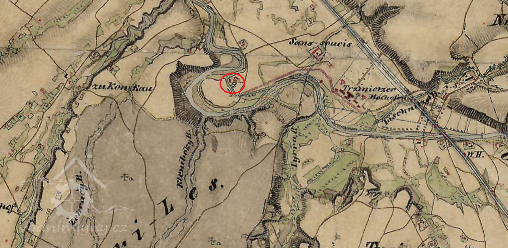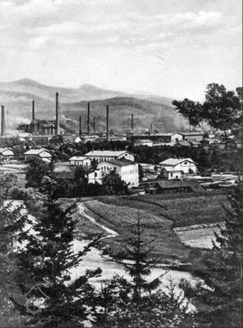 Zaniklý mlýn a pila ve velkém meandru řeky Olše, dnes v areálu Třineckých železáren.