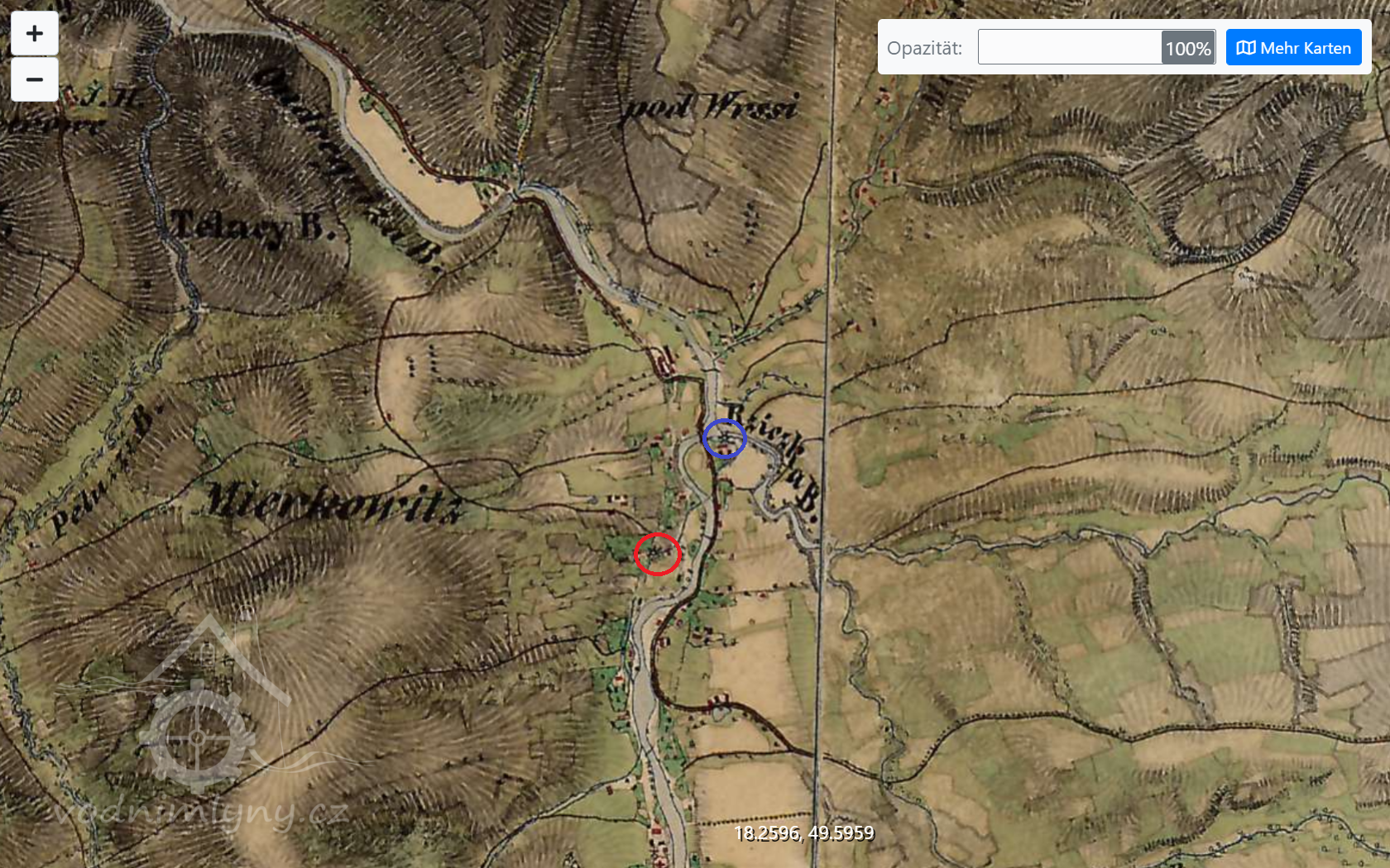 1,2 km severně od kostela sv. Michala a sv. Barbory v Kozlovicích