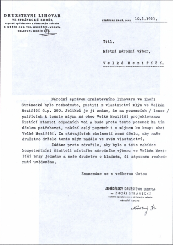 1951 lihovar nabídl mlýn k odprodeji MNV Vel. Meziříčí pro zřízení čistírny odpadních vod