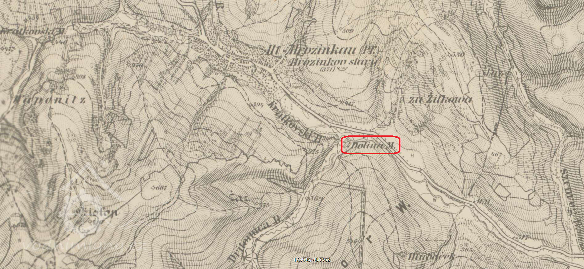 Mlýn se nachází v lokalité Dolina.Směrem na slovenské hranice.