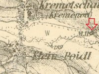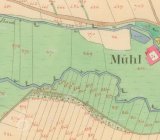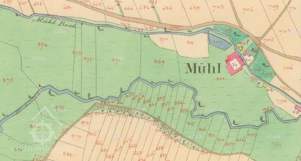 Osamocený Křemačovský mlýn měl vlastní náhon plus vypouštěná voda z mlýna v Podolíčku (1834).