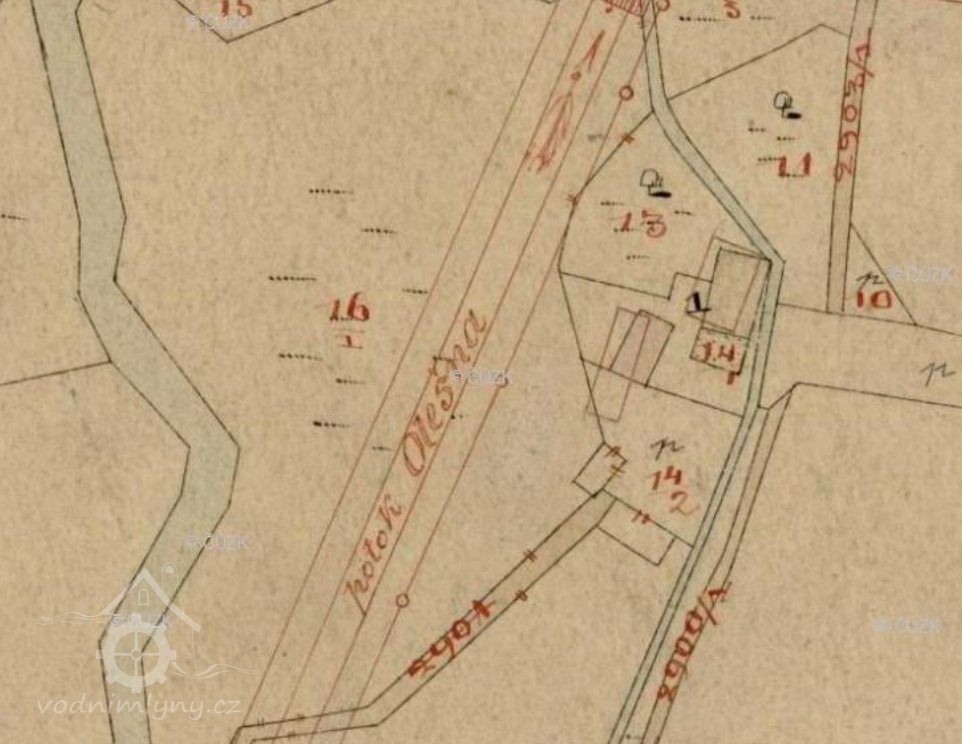 „Okolo roku 1900 se přestalo mlíti ve mlýně pod dědinou čp. 2 u Olešné, jehož majitelem byl Josef Pustka.  K mlýnu náležel slušný kus rolí a louky podél Olešny. Olešna se často vylévala a dělala škodu na lukách mlynářových i na sousedních lukách kostelních. Farář P. Ferdinand Baar i mlynář Josef Pustka dělali hráze, ten na ochranu svých, onen na ochranu kostelních luk. Kdykoli učinil opatření některý z nich, stěžoval si druhý, že mu to škodí.A tak se dostali do sporů bez konce a do bezpříkladného nepřátelství. Věc zůstala do smrti Pustkovy nevyřízena.“