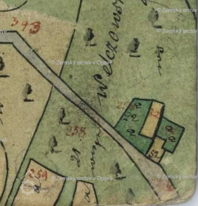 Voda na mlýn prý byla vedena dřevěným visutým korytem (vantroky), které šlo přes celou alej. To znamená, že mlýn stával na tom samém náhoně jako Kirchhofova textilka.