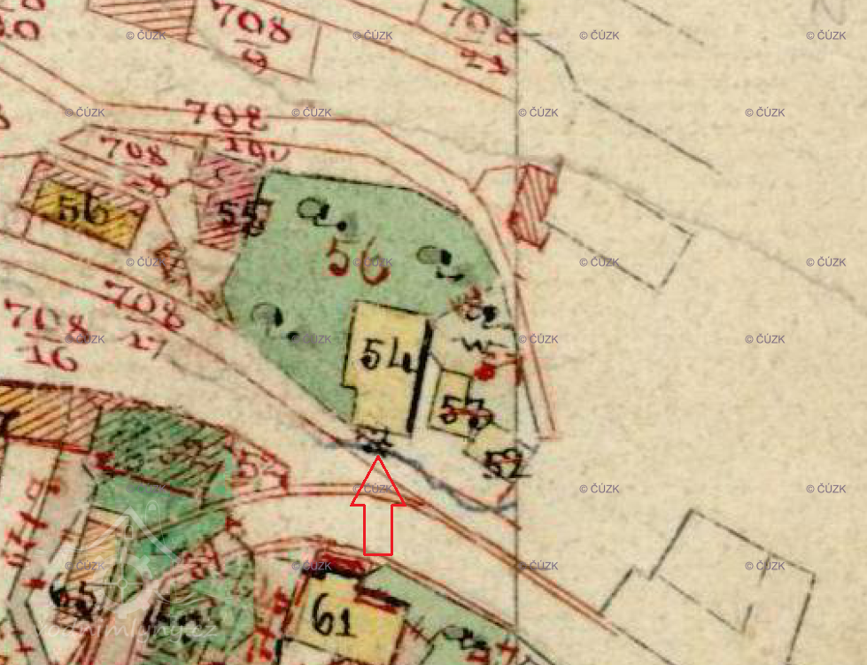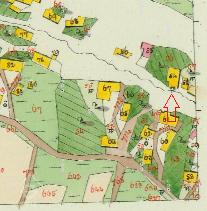 Dřevěná budova zaniklého mlýna poháněného jedním vodním kolem stála na pozemcích č. 54 a 56 v sousedství budovy čp. 28. Mlynářská činnost zde byla ukončena na začátku 20. století.