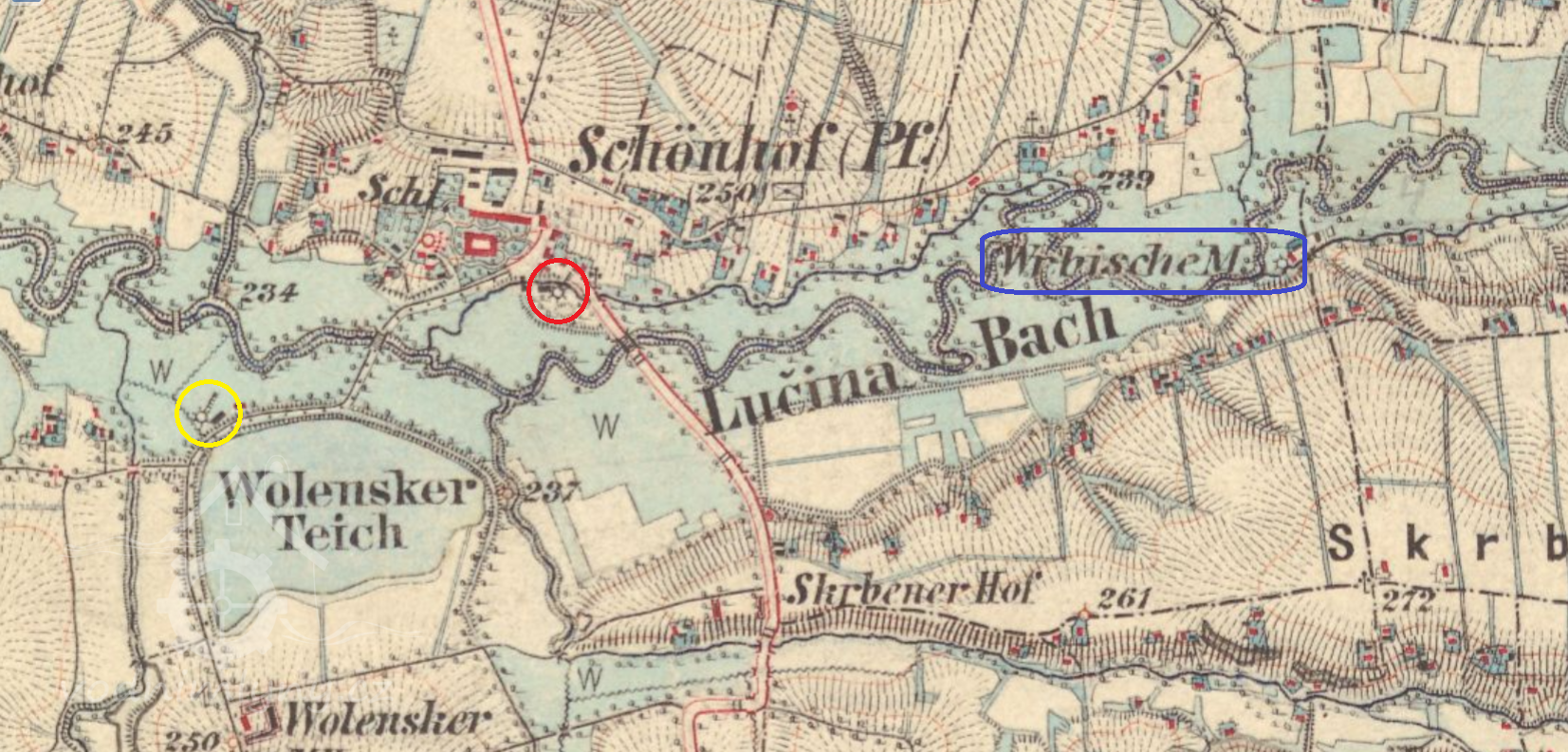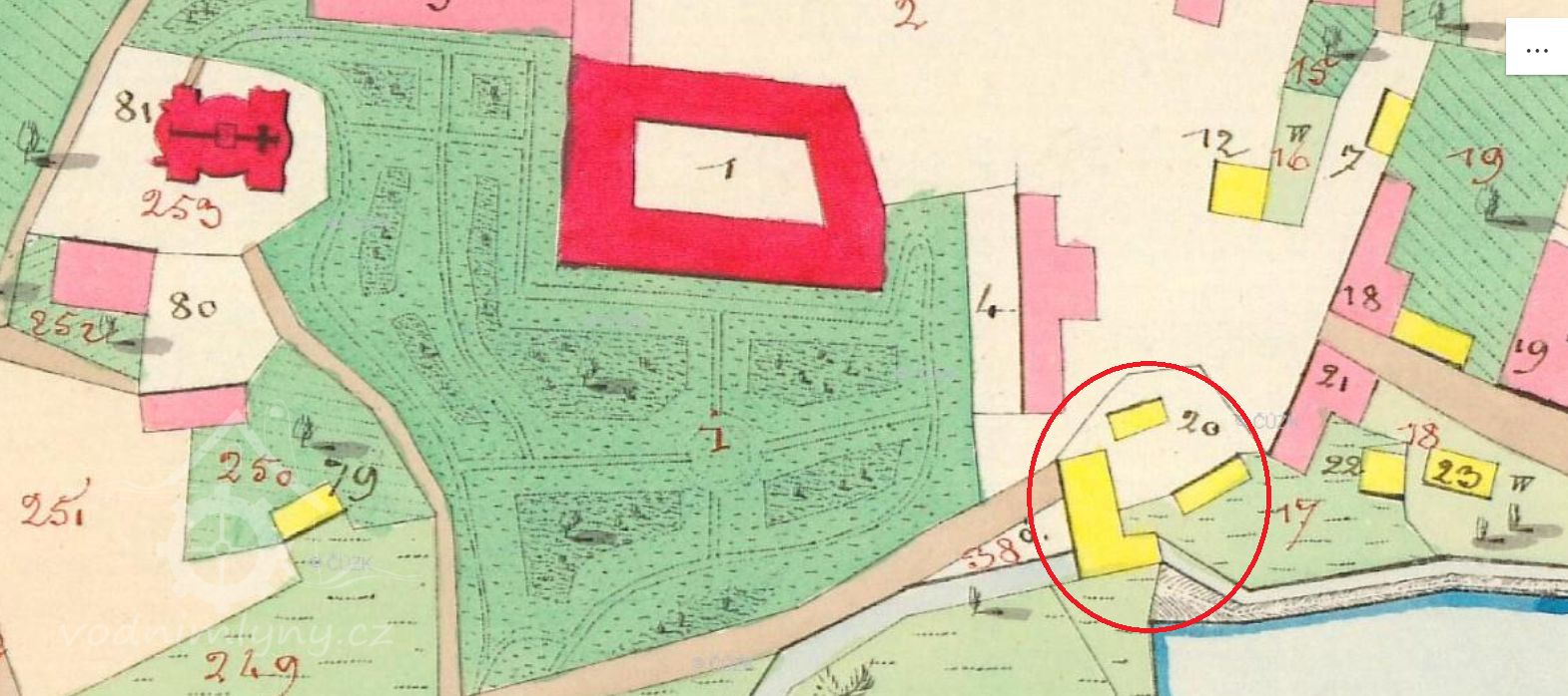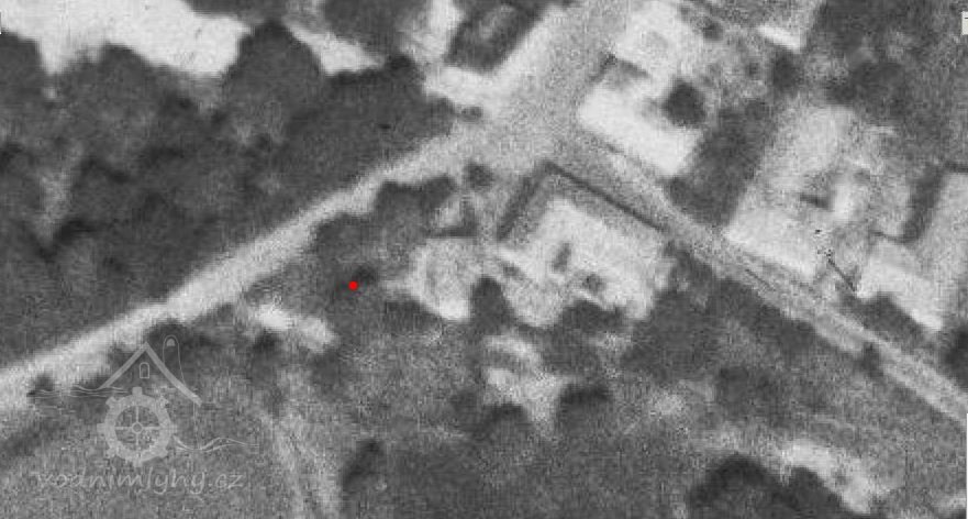 Zaniklý mlýn pod zaniklým zámkem. Mlýniště leží v soukromé zahradě.