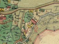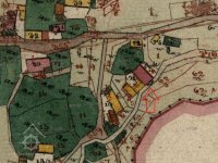 Dle vyobrazení na mapách stabilního katastru zděná budova obdélníkové půdorysu se dvěma přilehlými budova ze spalného materiálu na západní straně.