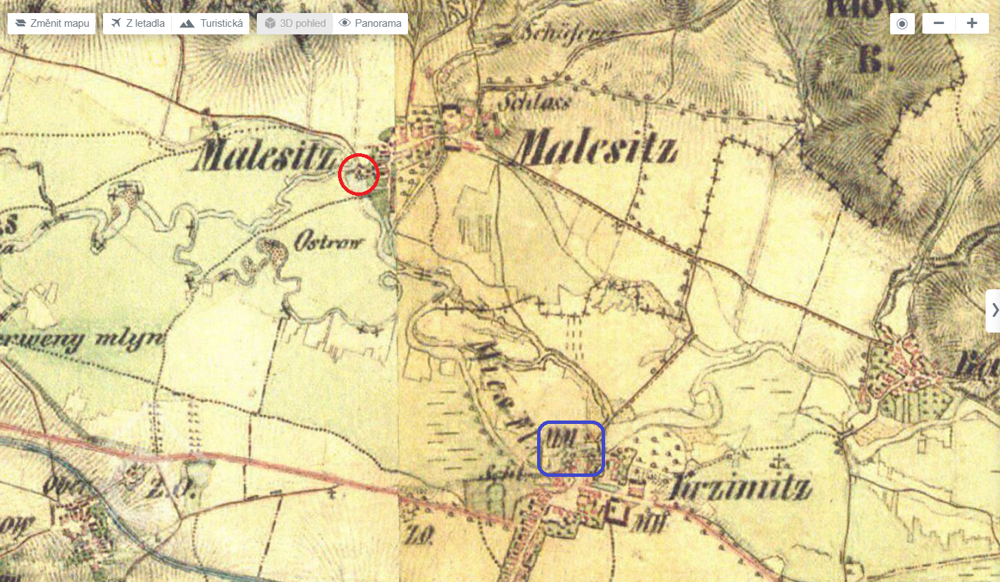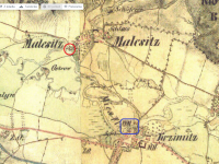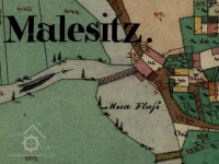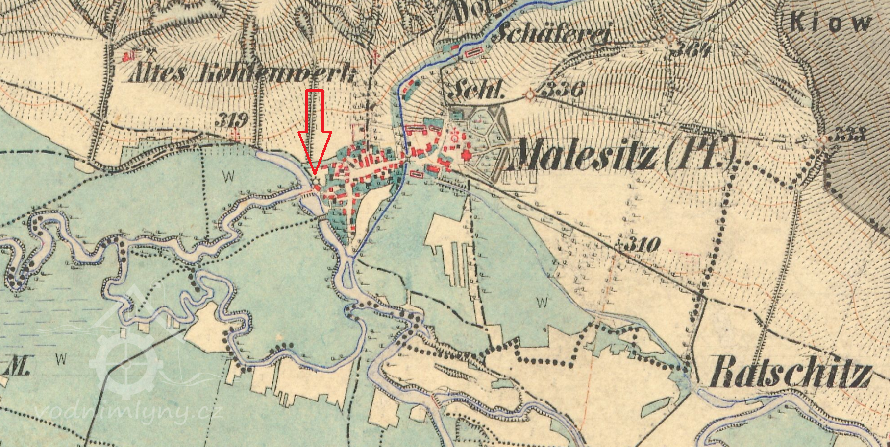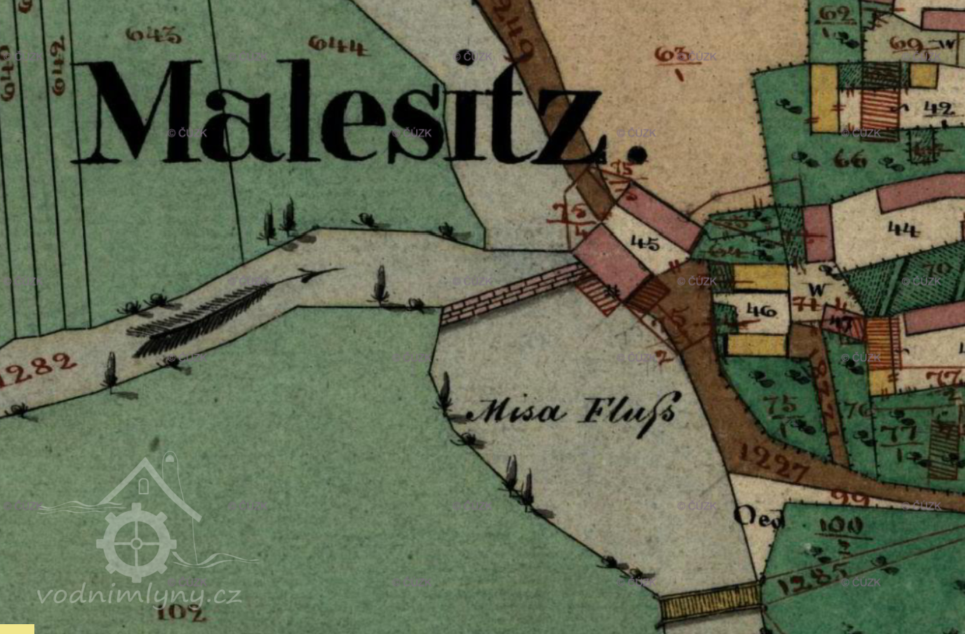 Malesický (červeně) a Křimický (modře) mlýn, II. vojenské mapování, výřez, 1836-1852, © mapy.cz