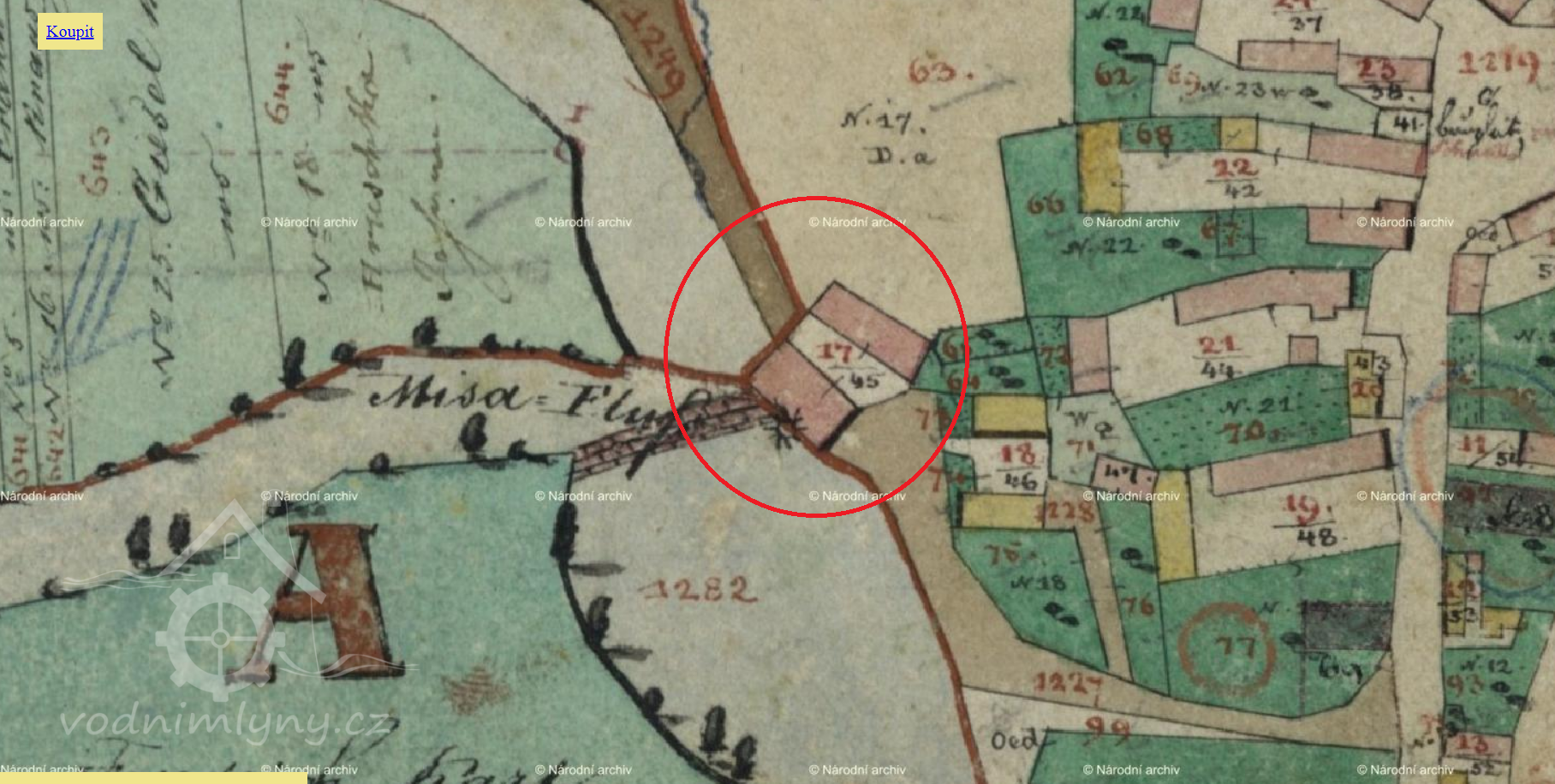 Kozolupský (červeně) a Čeevený (modře) mlýn, I. vojenské mapování, výřez, 1764-1768, © oldmaps.geolab.cz