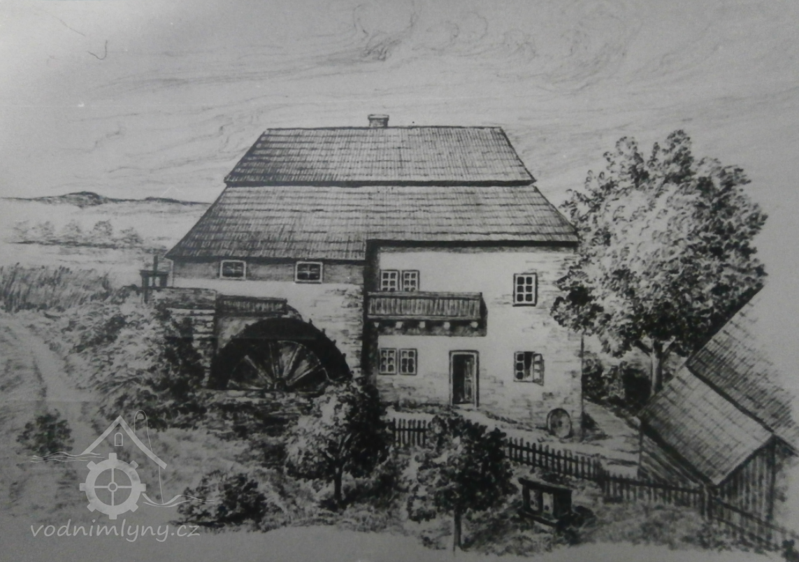 Peerovský mlýn 1741 - 1830, rekonstrukce pravděpodobného vzhledu kol r. 1830, 1930, © připravil Vlastimil Peer, kreslil Karel Liška