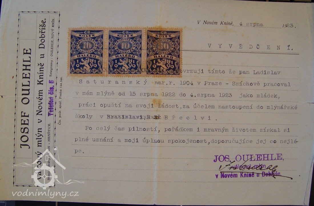 Vysvědčení mlynářskému učni, 1923, © siukromá sbírka