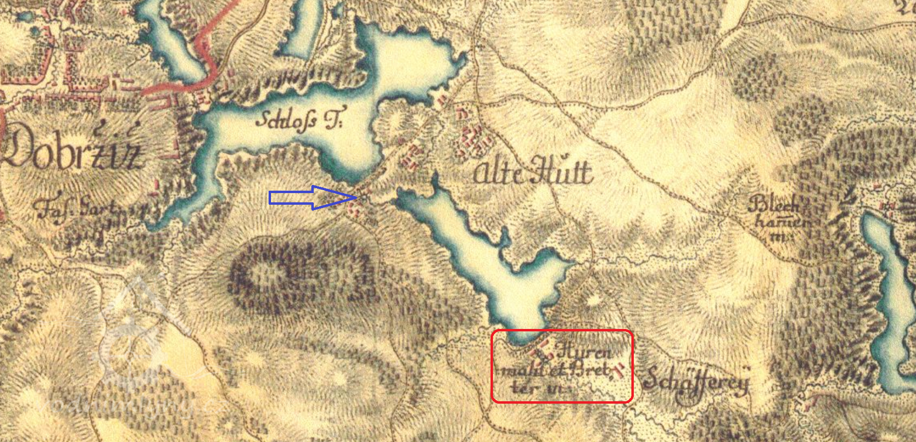 Mlýny Kurvice (červeně) a Starohuťský (modře), I. vojenské mapování, výřez, 1764-1768, © oldmaps.geolab.cz
