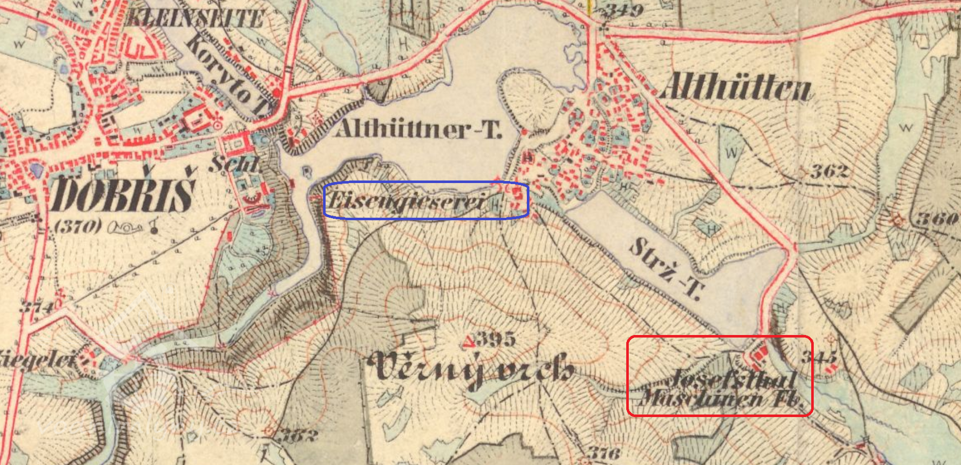 Bývalé mlýny Kurvice (červeně) a Starohuťský (modře), III. vojenské mapování, výřez, 1877-1880, © oldmaps.geolab.cz