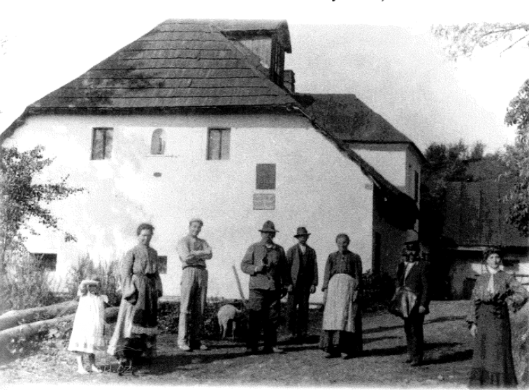 Pohled na mlýn a jeho osazenstvo (mlynář čtvrtý zleva), 1930, © Archiv Mgr. Naděždy Kubešové-Lehnerové