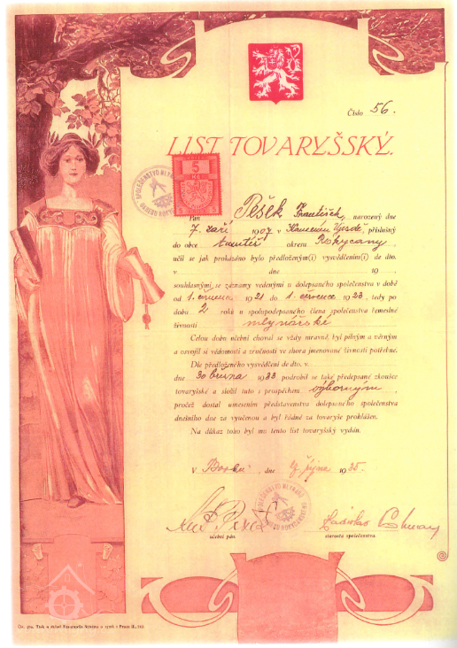 Tovaryšský list Františka Peška, 1933, © archiv Františka Peška