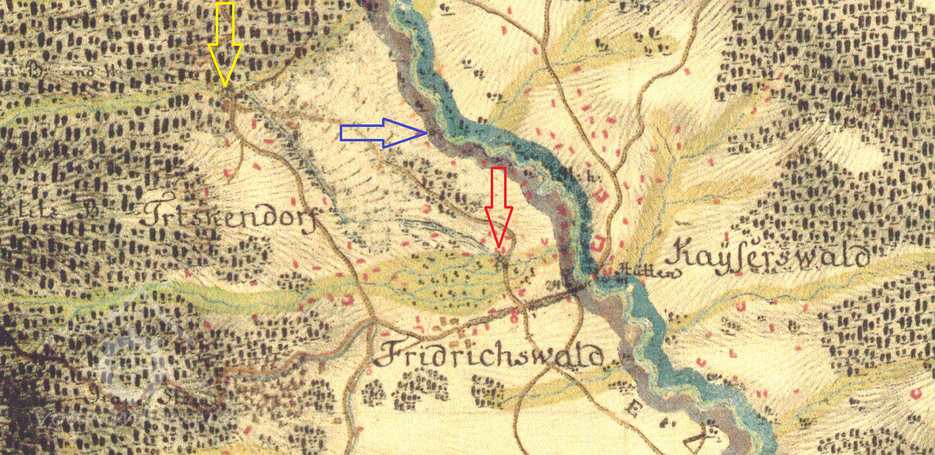 Trčkovský (červeně), Orlický (modře) a Lesní (žlutě) mlýn v Trčkově, I. vojenské mapování (výřez), 1764-1768, © oldmaps.geolab.cz