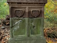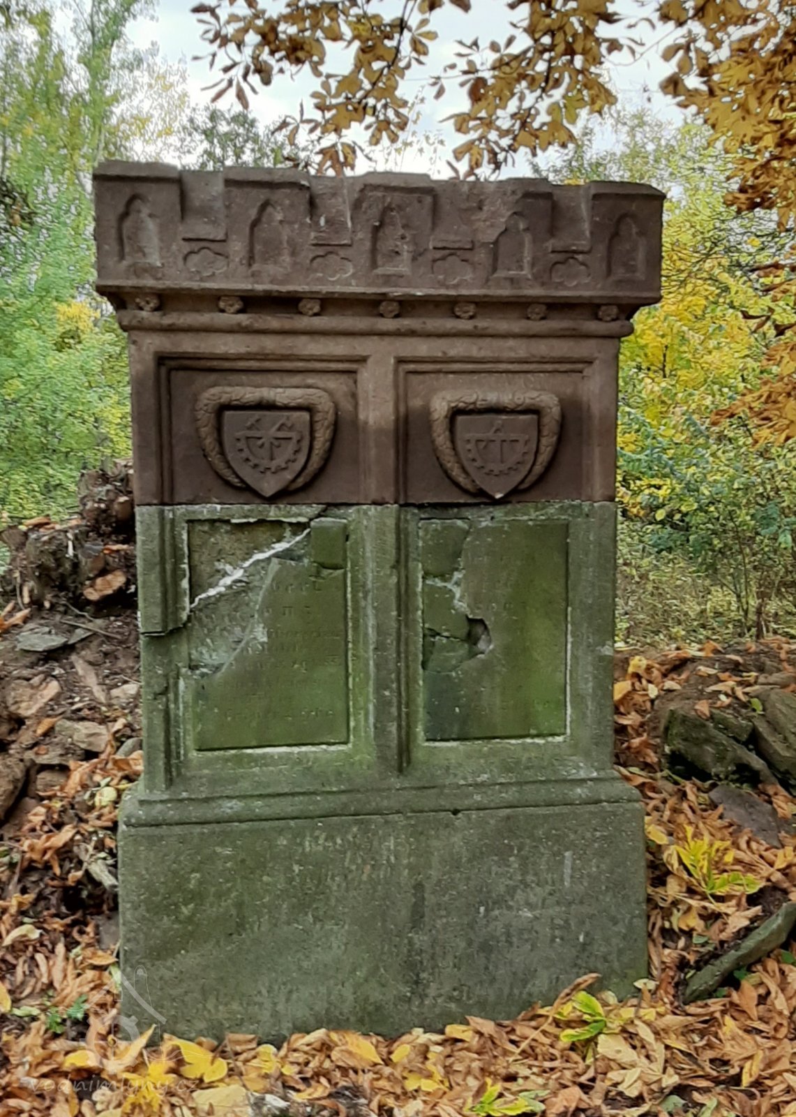 Rekonstruovaný náhrobek Adalberta Franze (1799-1854) a jeho manželky Theresie (1808-1854). Náhrobek je poslední zachovalý artefakt na bývalém hřbitově u kostela v Kozlově, 17. 10. 2019, © Jan Kruliš