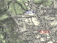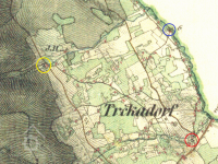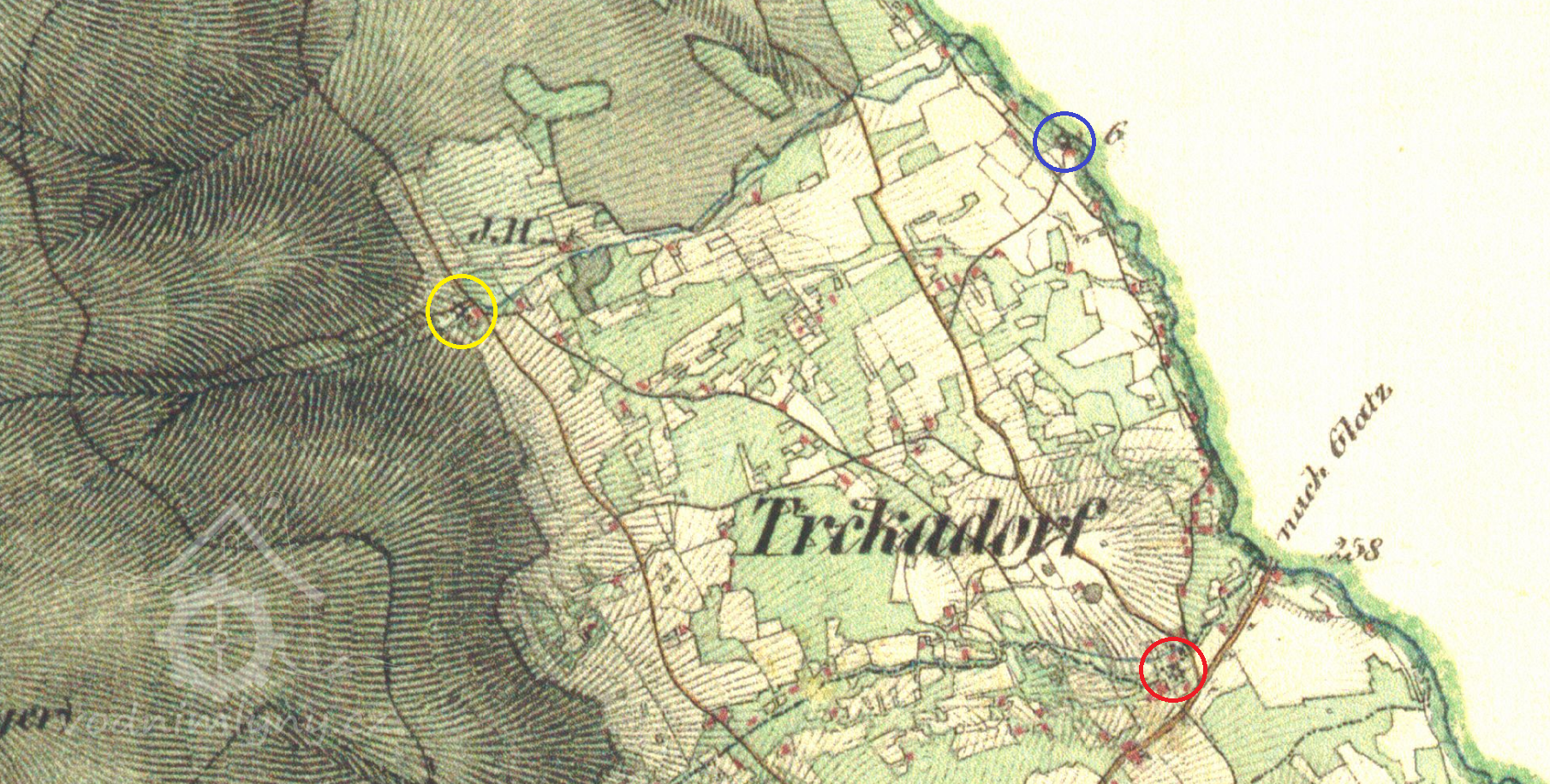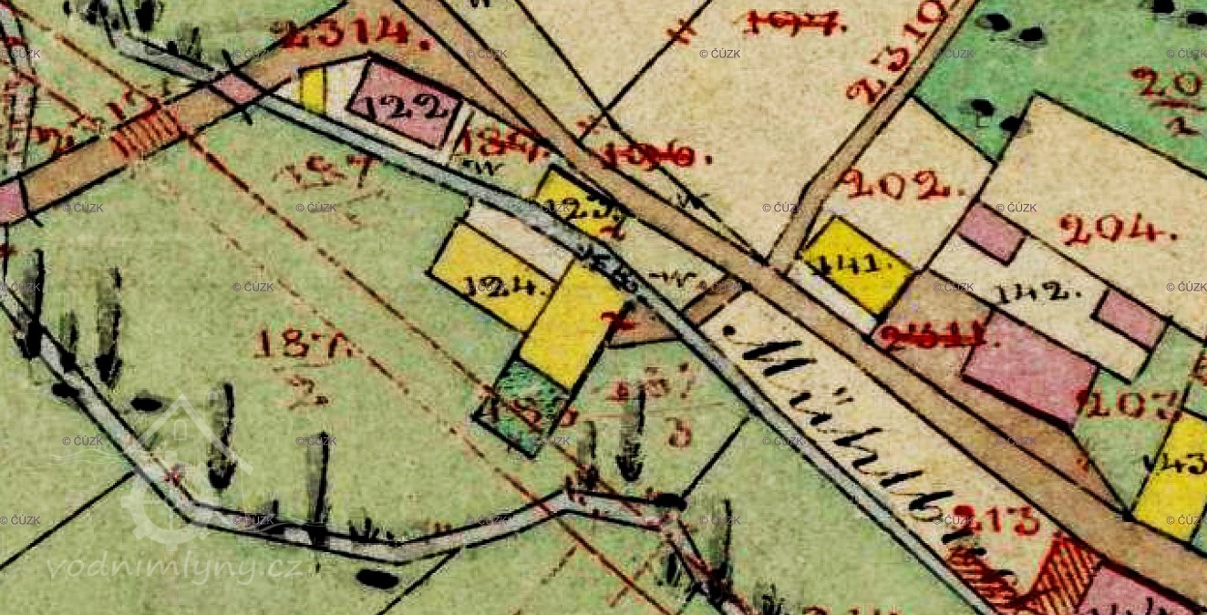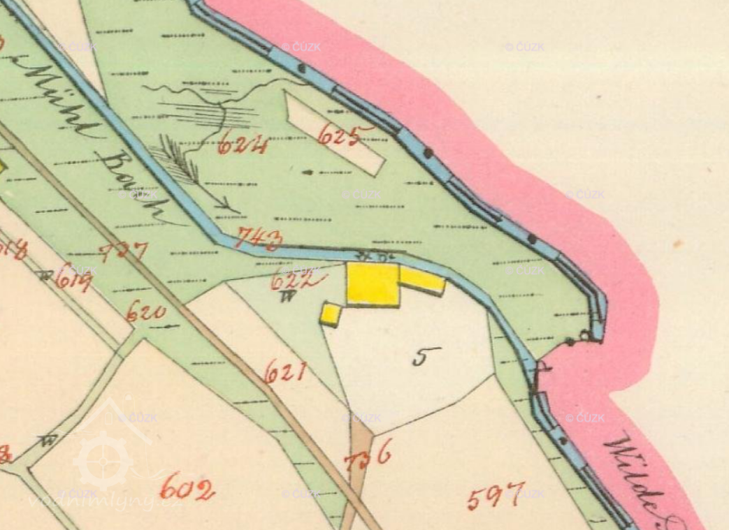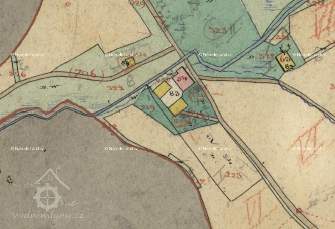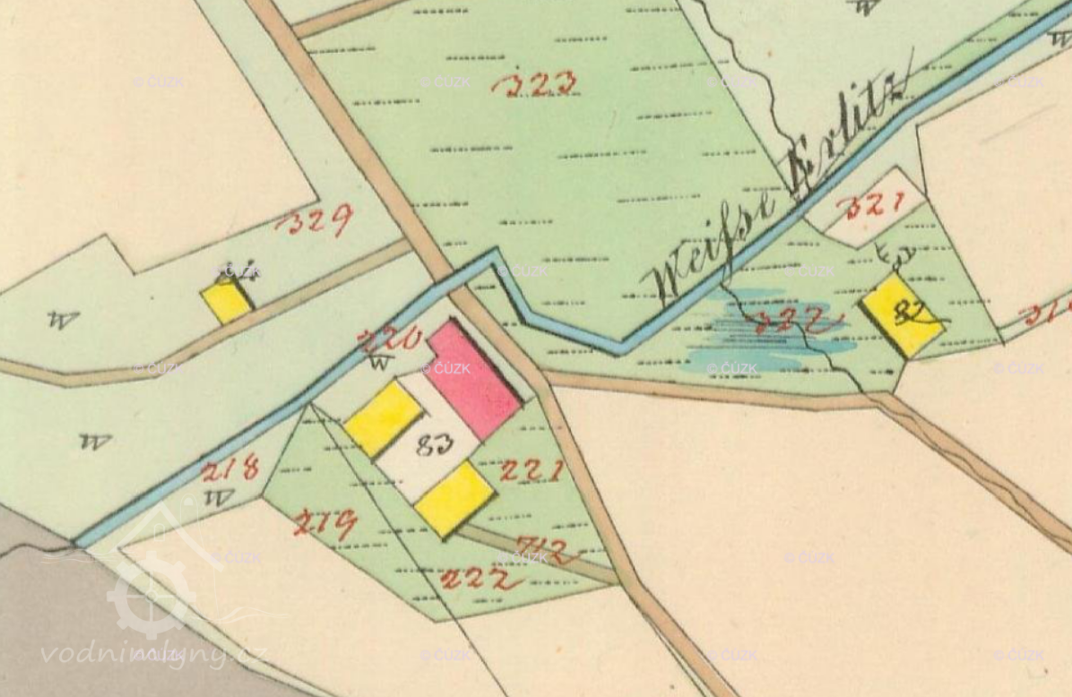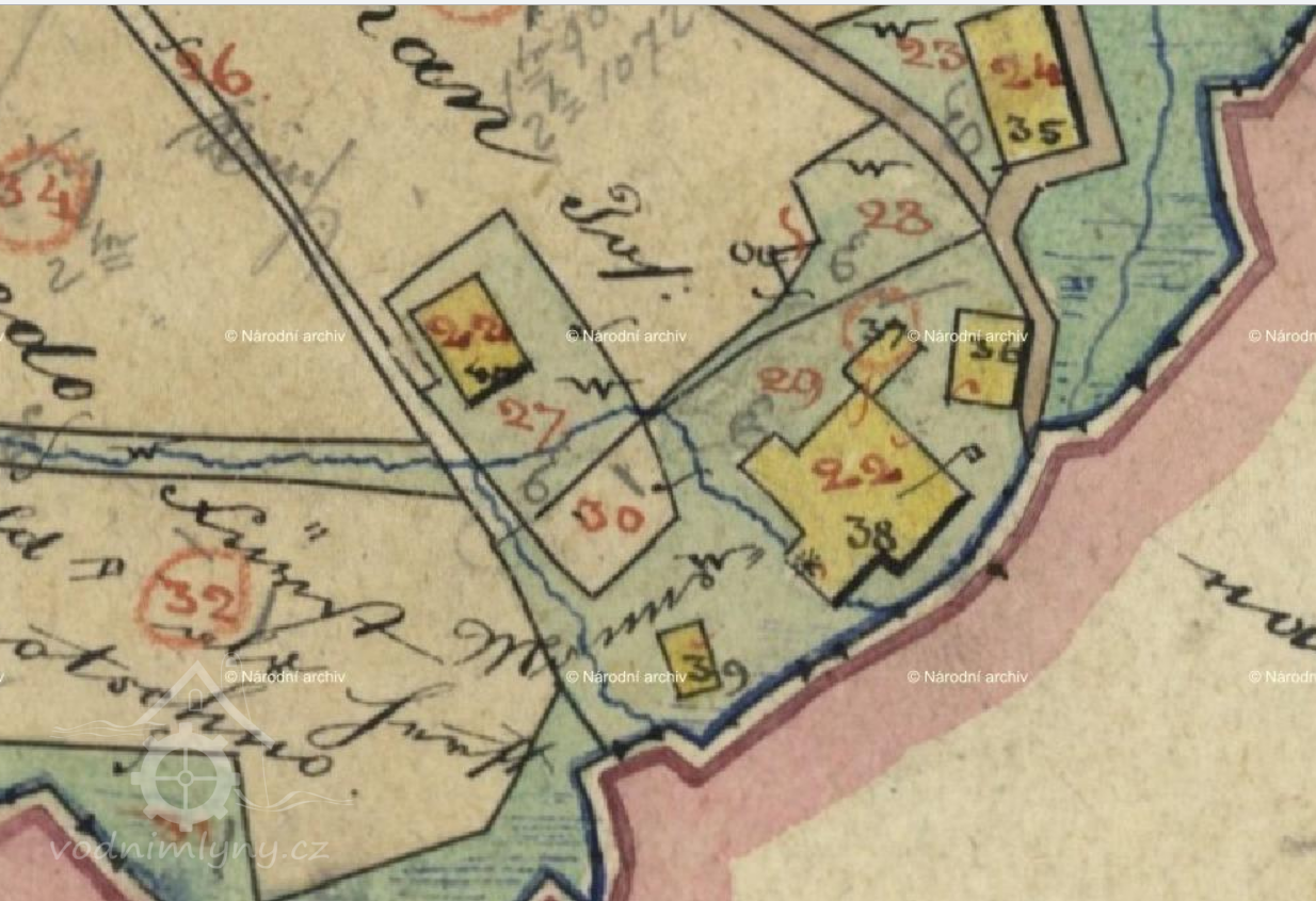 Trčkovský (červeně), a Orlický (modře) mlýn v Trčkově, III. vojenské mapování (výřez), 1836-1852, © oldmaps.geolab.cz
