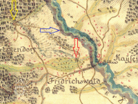 Trčkovský (červeně), Orlický (modře) a Lesní (žlutě) mlýn v Trčkově, I. vojenské mapování (výřez), 1764-1768, © oldmaps.geolab.cz