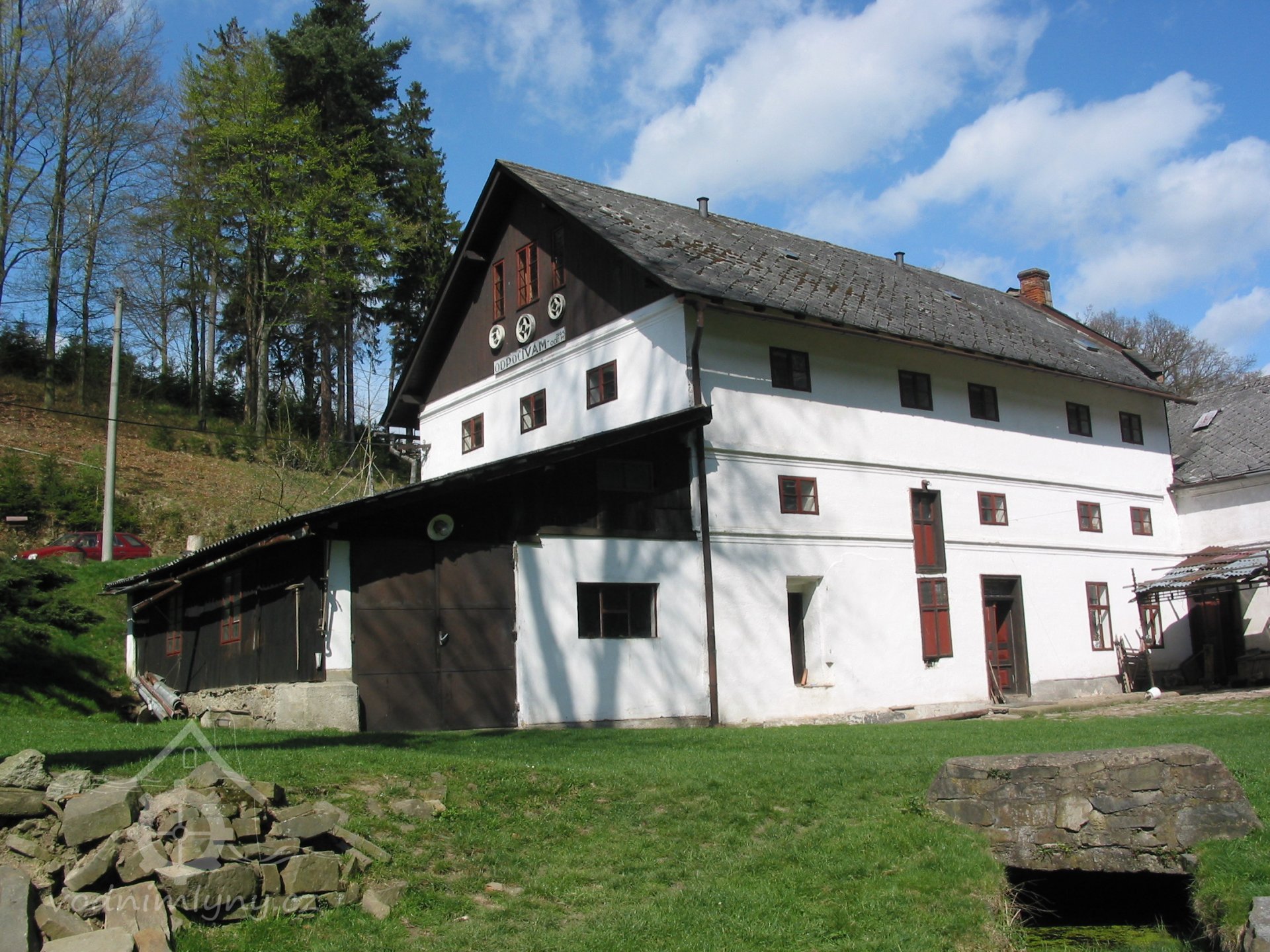 Celkový situační nákres mlýnu Plechhammer před instalací Francisovy turbíny, která zbavila mlýn trojice vodních kol, které jdou na nákresu vidět. Třetí kolo pohánělo pilu, která byla dřevěná a nacházela mezi budovou a studnou. Na druhém plánu je označená písmenem „F“. „A“ je přízemní nástavba budovy, kde se nacházely pokoje, dole v přízemí byla kuchyň a komora. Písmenem „E“ je označen sklep vytesaný ve skále a také hospodářská přístavba, kde byla vlevo maštal, sklad a úplně vpravo i pekárna. Tato budova byla i pilou a spekuluje se, že na začátku i hamrem., 1900, © Petr Kadlec - archiv