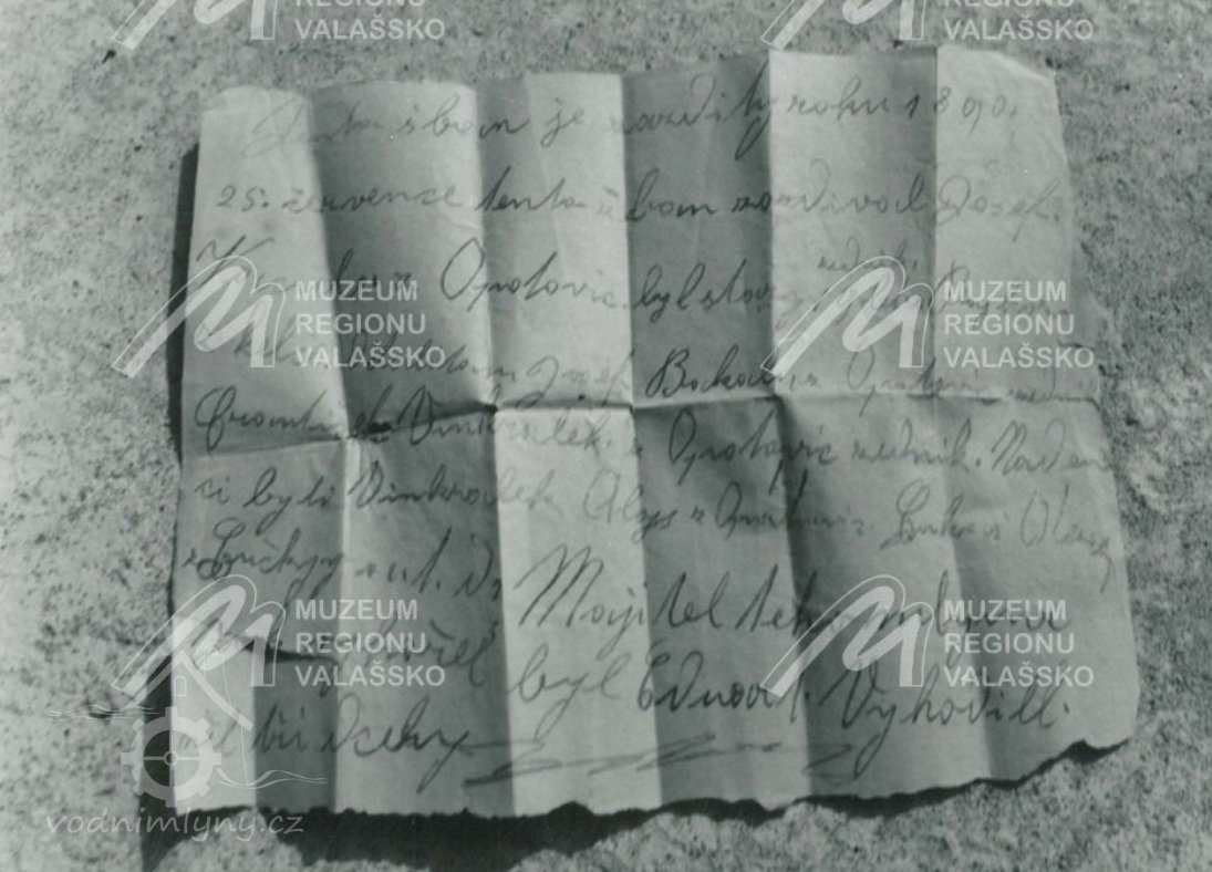 Nalezený zazděný pamětní lístek, 1890, © Miroslav Langer - Fotoarchiv Muzea regionu Valašsko