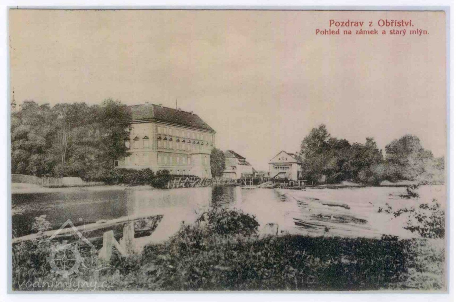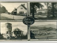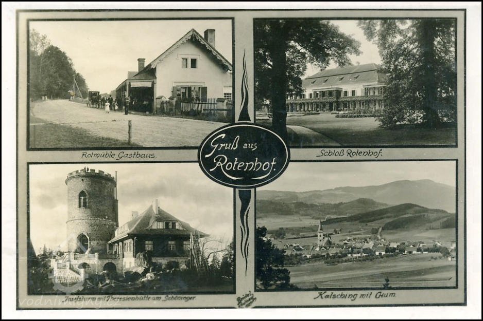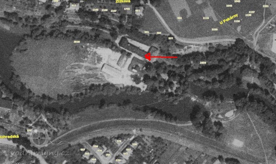 Mlýn na historické pohlednici (nahoře vlevo), 1938, © autor neznámý, viz. http://www.fotohistorie.cz/
