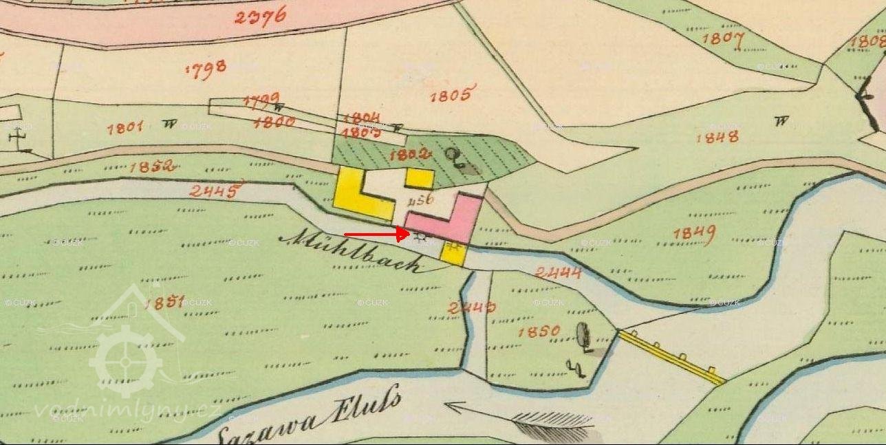 Císařský povinný otisk, výřez. Poptácký mlýn v Havlíčkově Brodě čp.13 st.p.č. 229, 1838, © viz archivnimapy.cuzk.cz