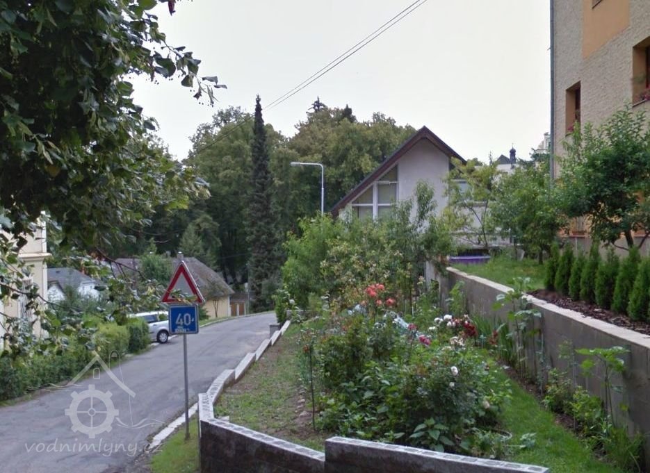 Mlýn Na Valech od západu z ulice Na Valech, květen 2012, © mapy.google.cz