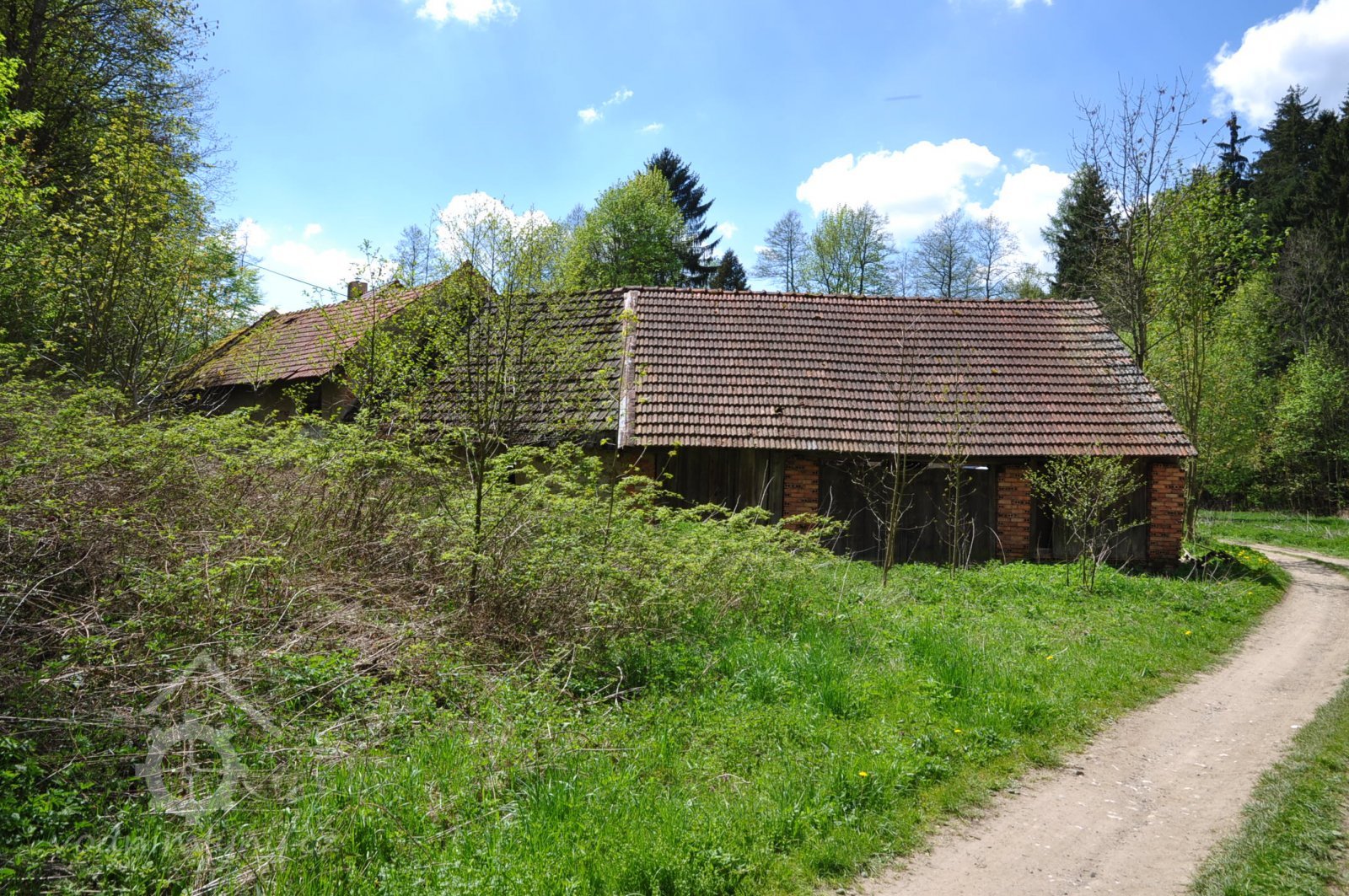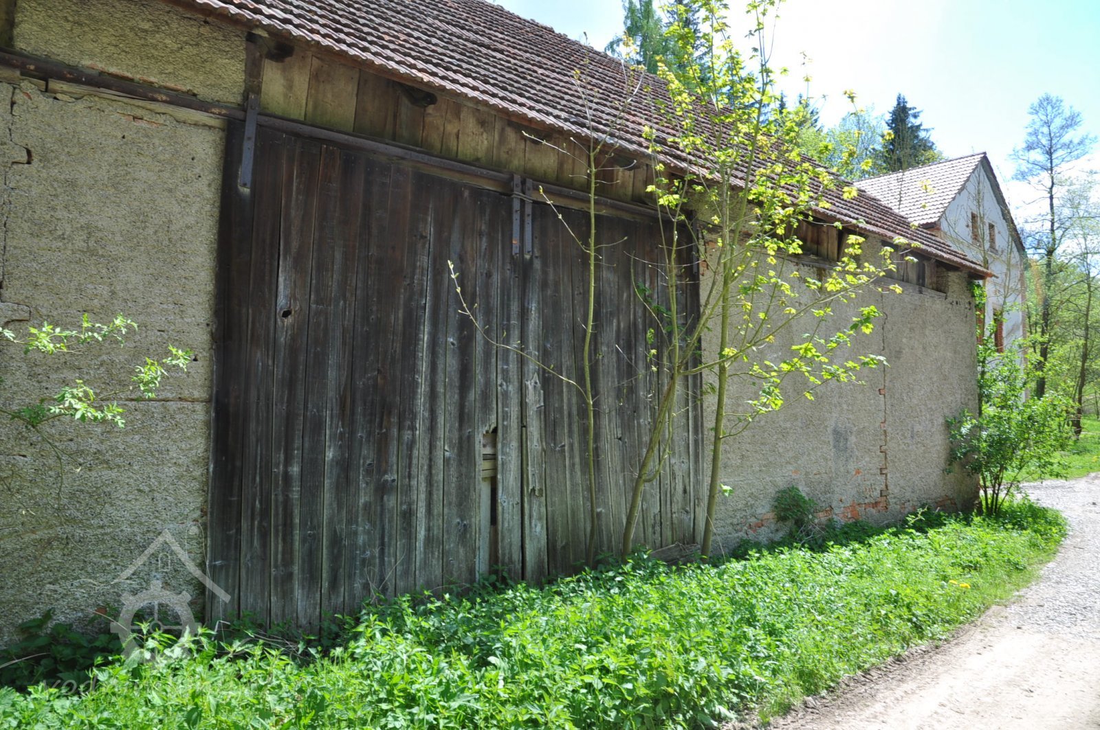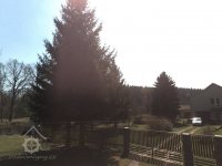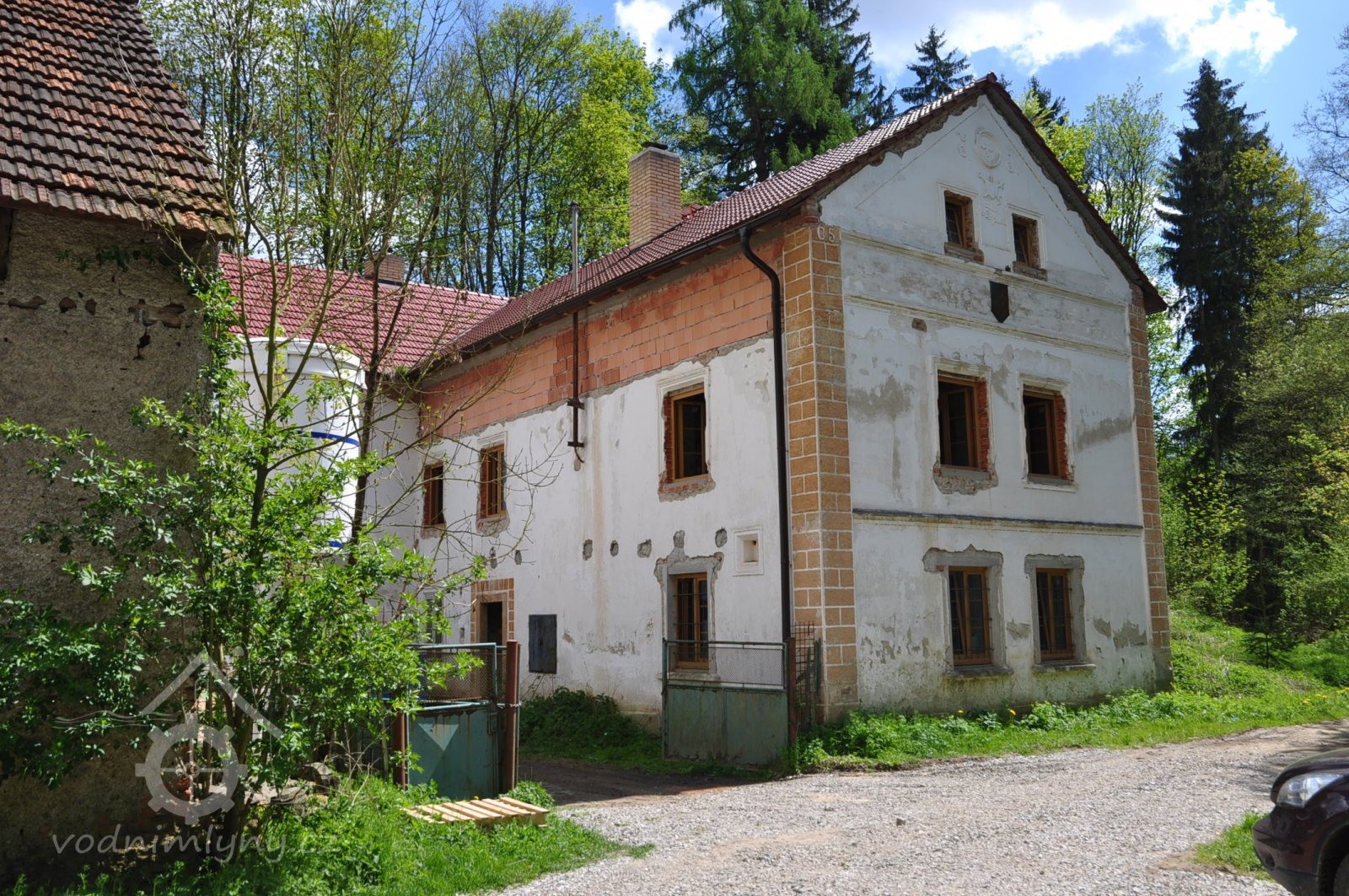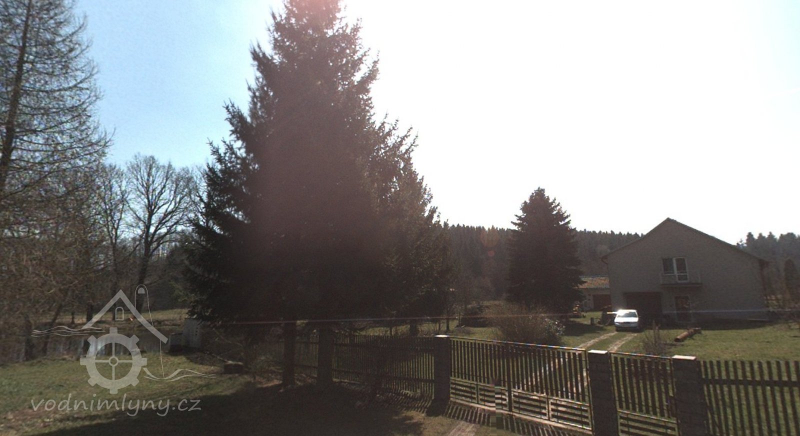 Mlýn se nachází za vysokým smrkem, duben 2015, © viz mapy.cz