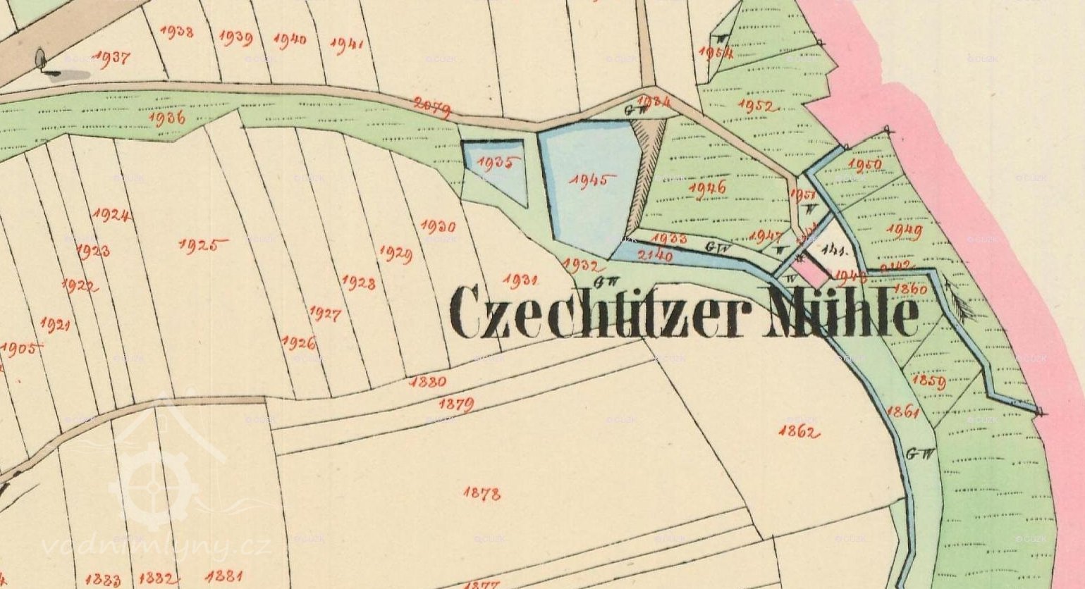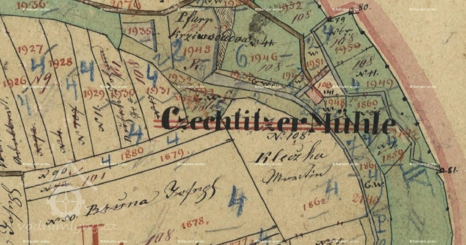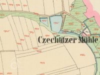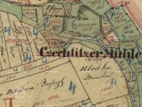 Mlýn vyobrazen na mapě Pozemkového katastru, před 1945, © viz http://geoportal.gepro.cz/