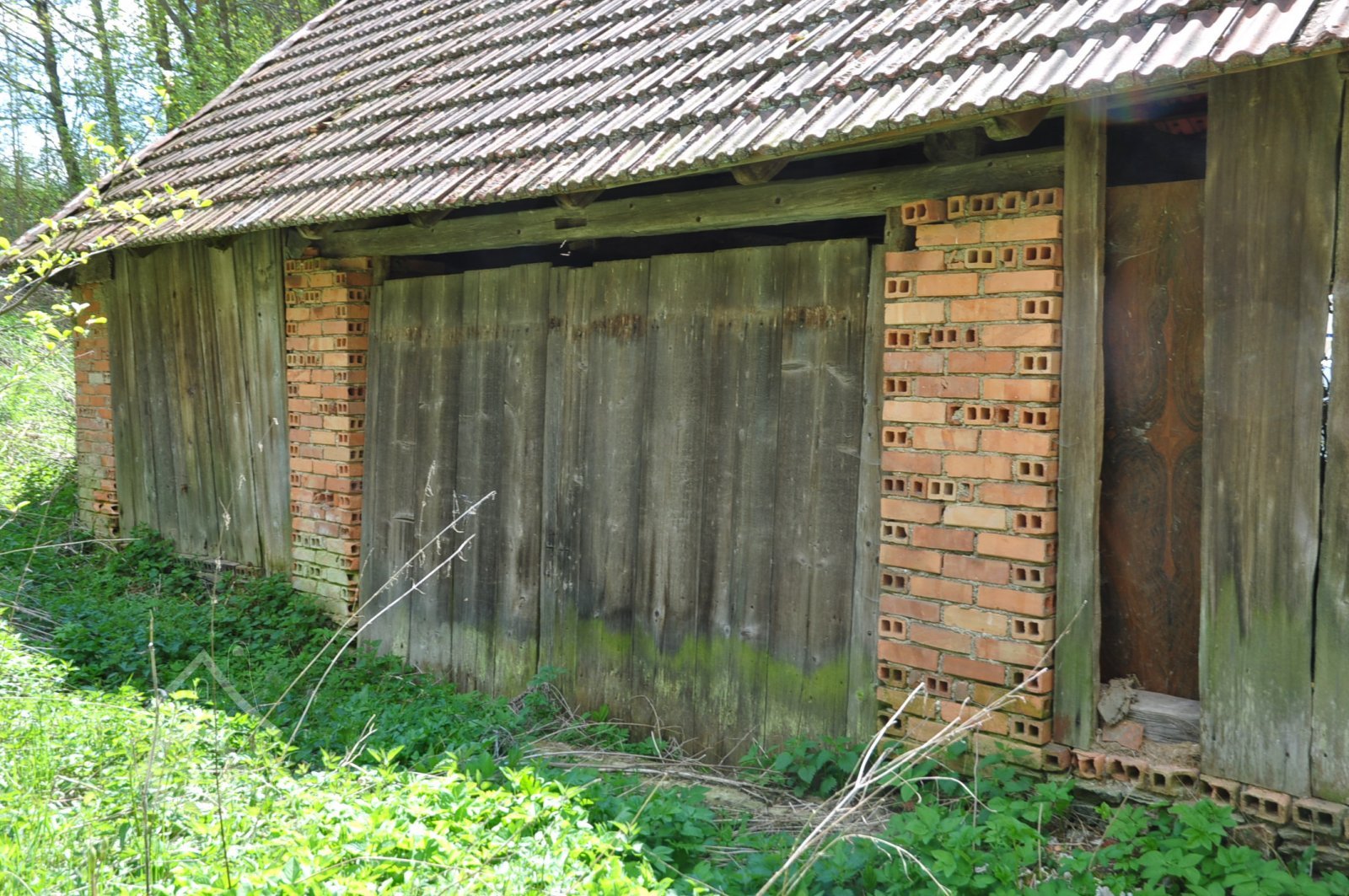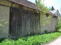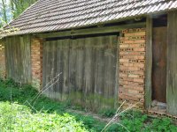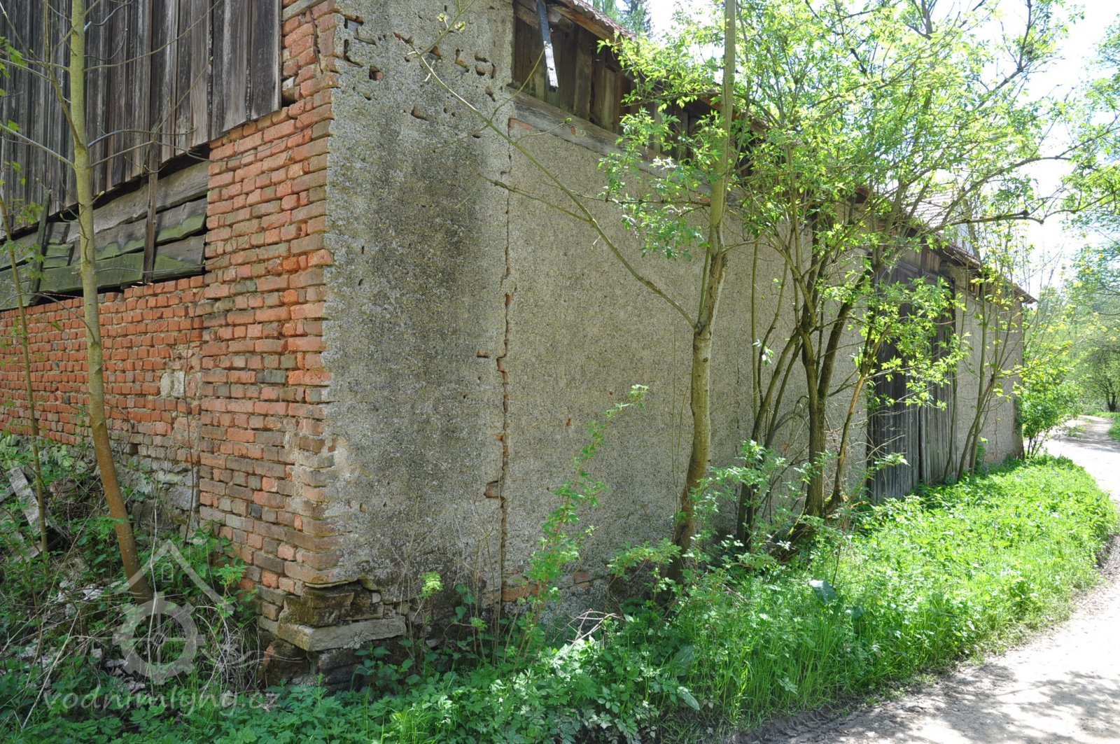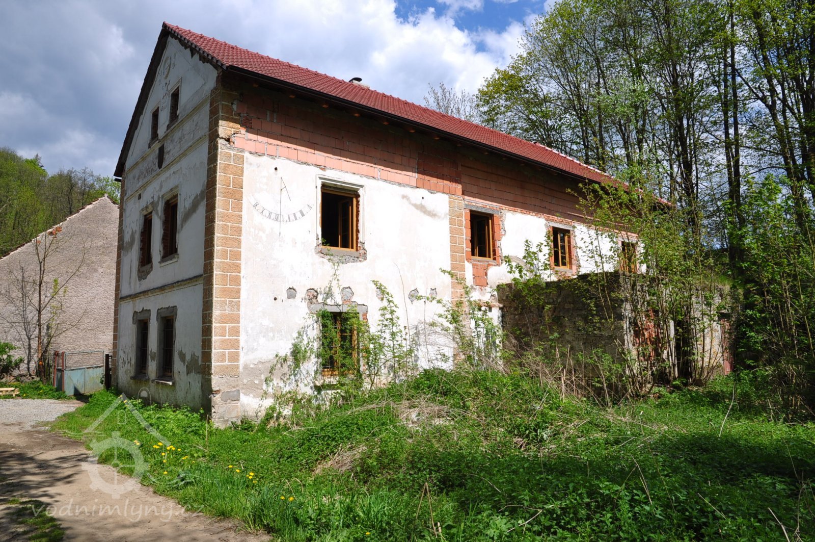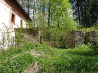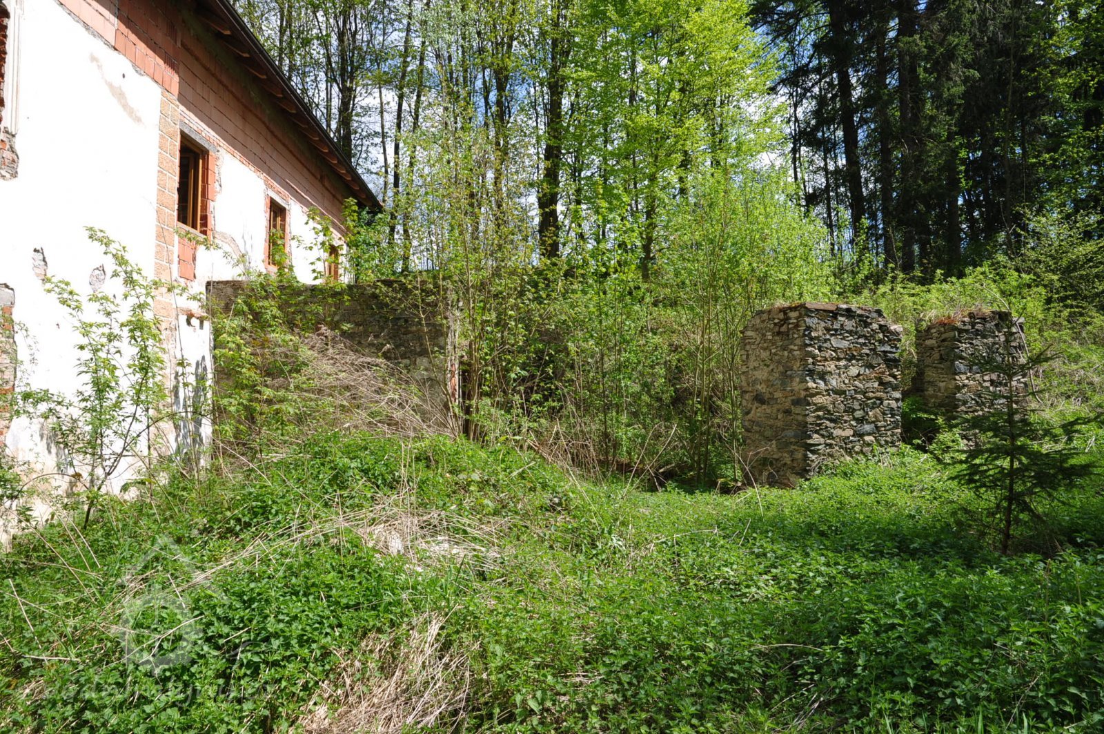 Bezprostředně ke mlýnu sahal rybník, zásoba vody při mletí. Pohled na severní stěnu mlýna. V levém štítě byla mlýnice., 6.7.2016, © pepino