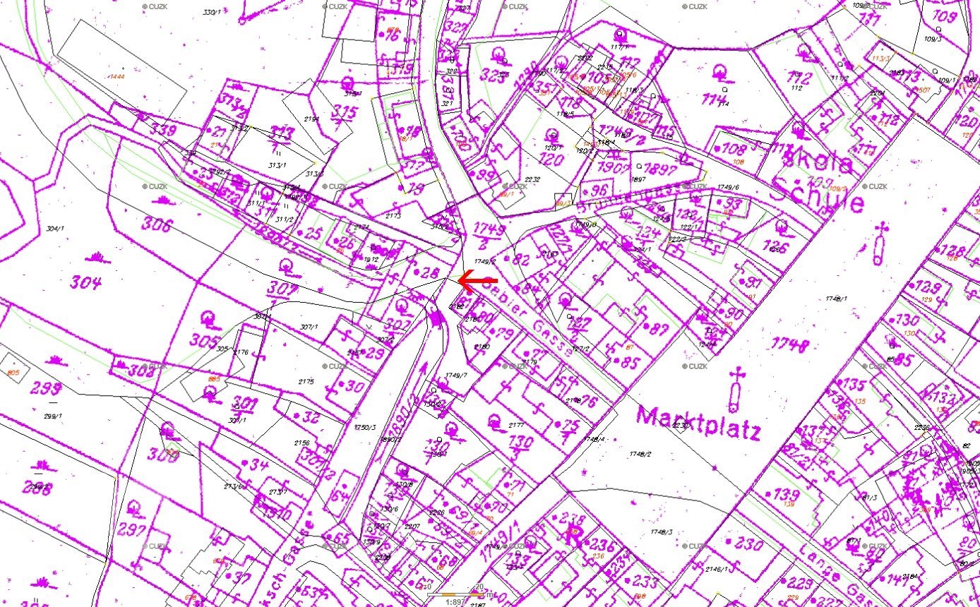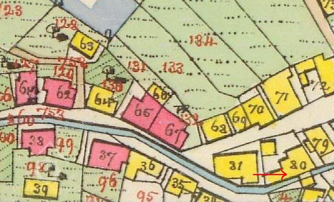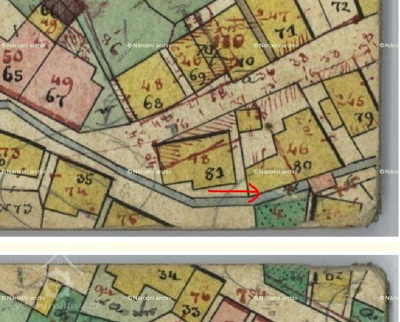 Pozemkový katastr překrytý současným katastrem, před 1945, © viz http://geoportal.gepro.cz/