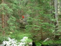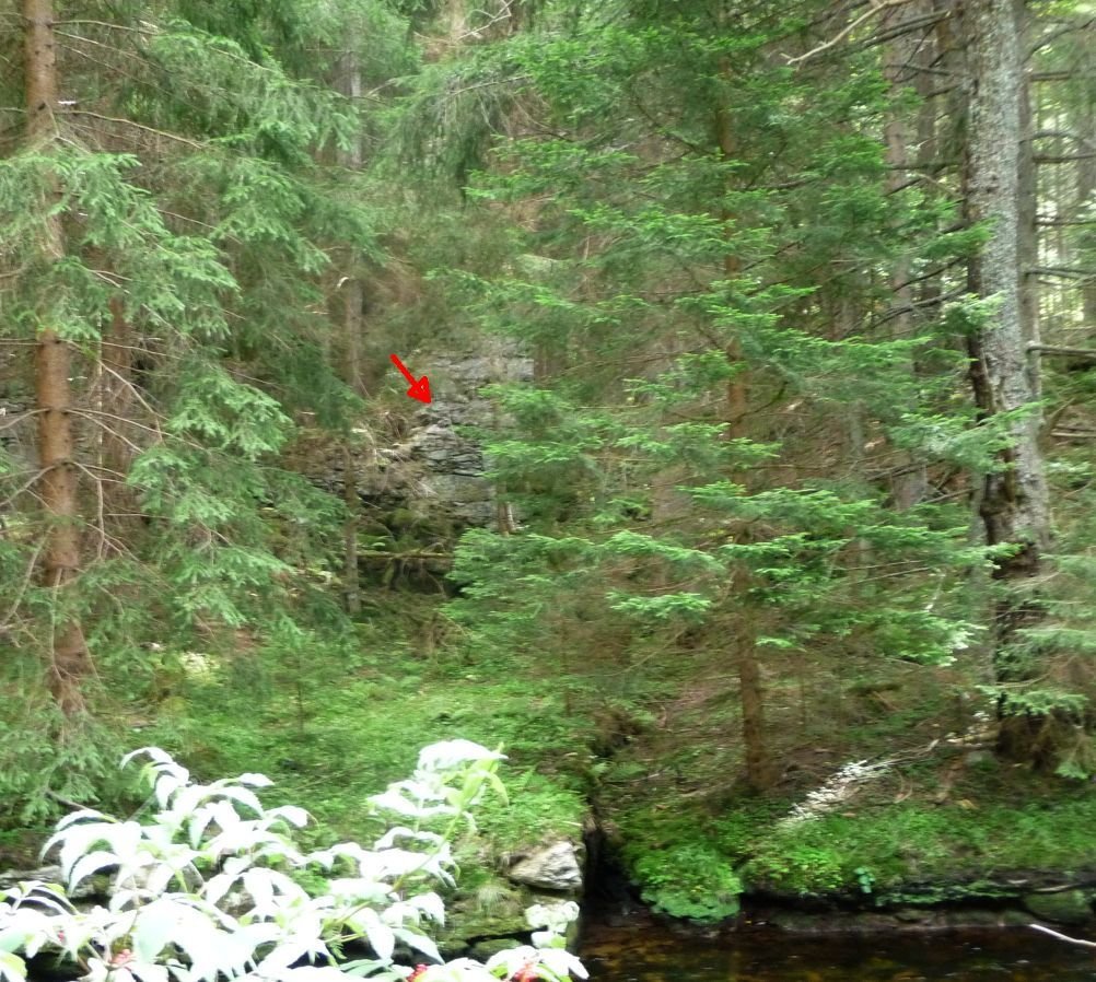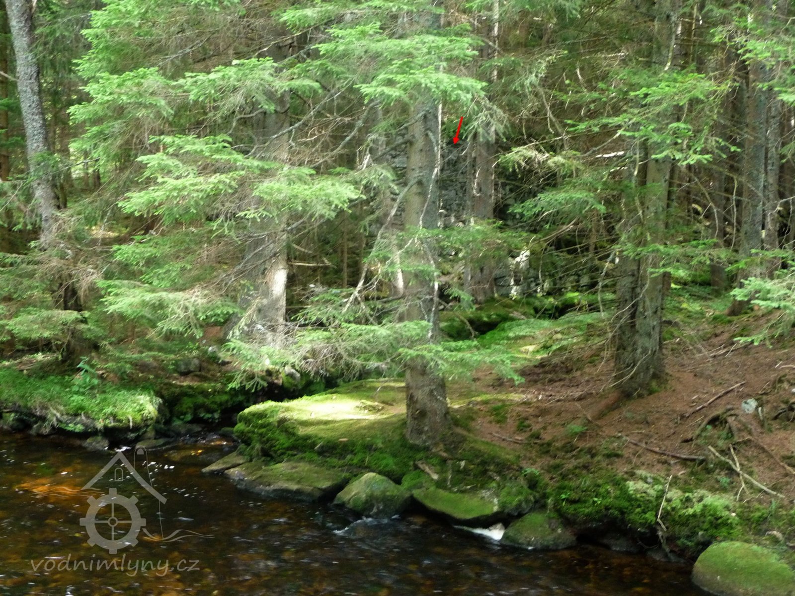Zbytky mlýna za plavebním kanálem zarostlé lesem - označeno šipkou, 2016, © Helena Špůrová