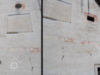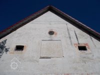 JV štít mlýnice s okénky a zaslepeným naskladňovacím otvorem - i zde zbytky červené omítky!, VIII./2016, © Kozel, (Prvky na obrázku: malovaná výzdoba fasád a štítů, vyskladňovací otvor)