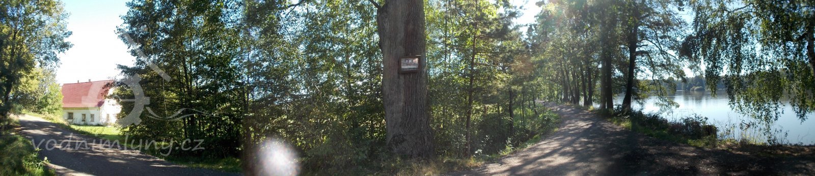 pokus o panorama: zleva cesta na Lhotku, mlýn, začátek náhonu, staletý dub, hrázní cesta a rybník Velká Jitra, VIII./2016, © Kozel
