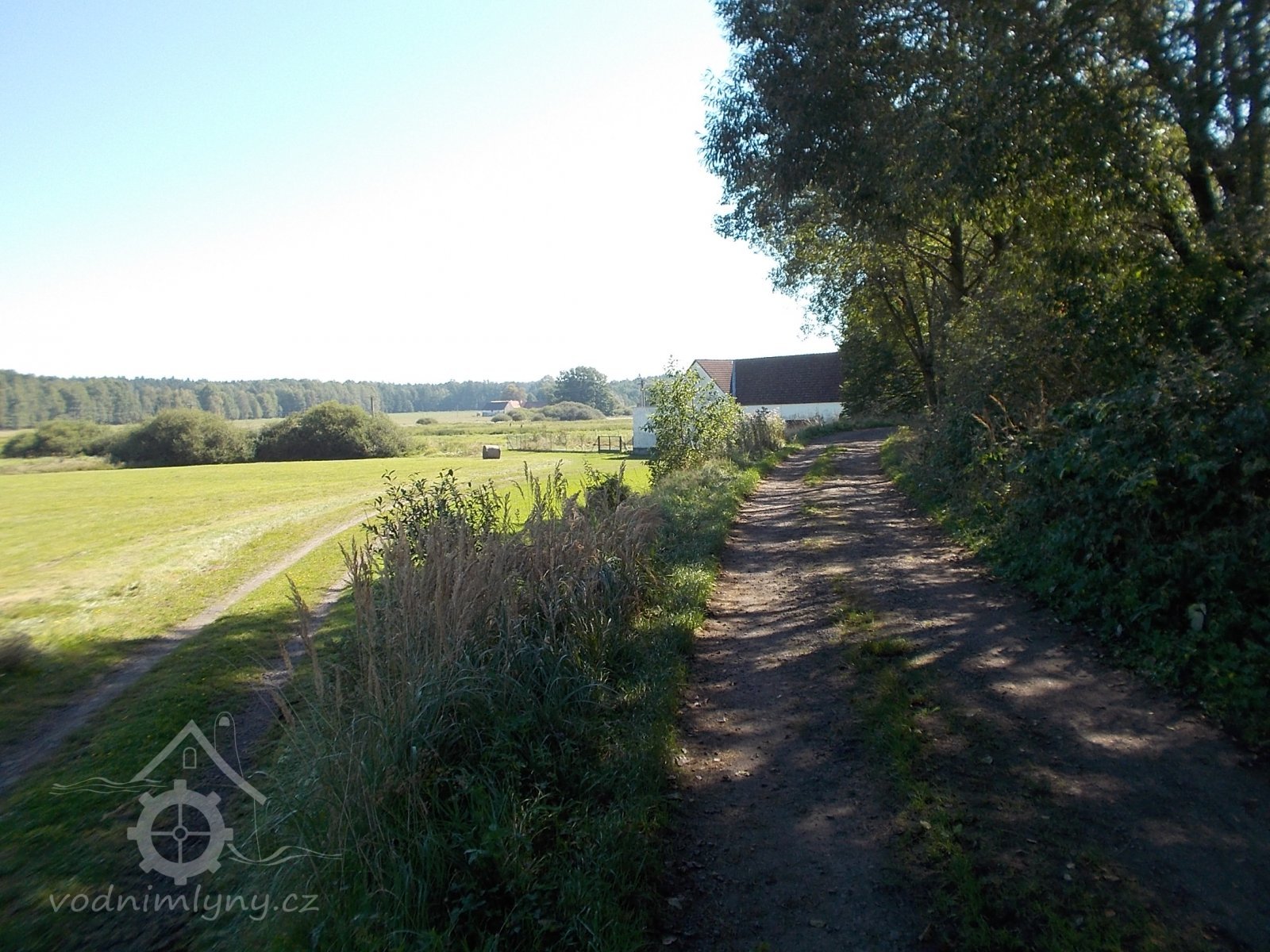 vlevo hráz s cestou, v prostoru mezi hrází a mlýnicí protékal náhon, VIII./2016, © Kozel