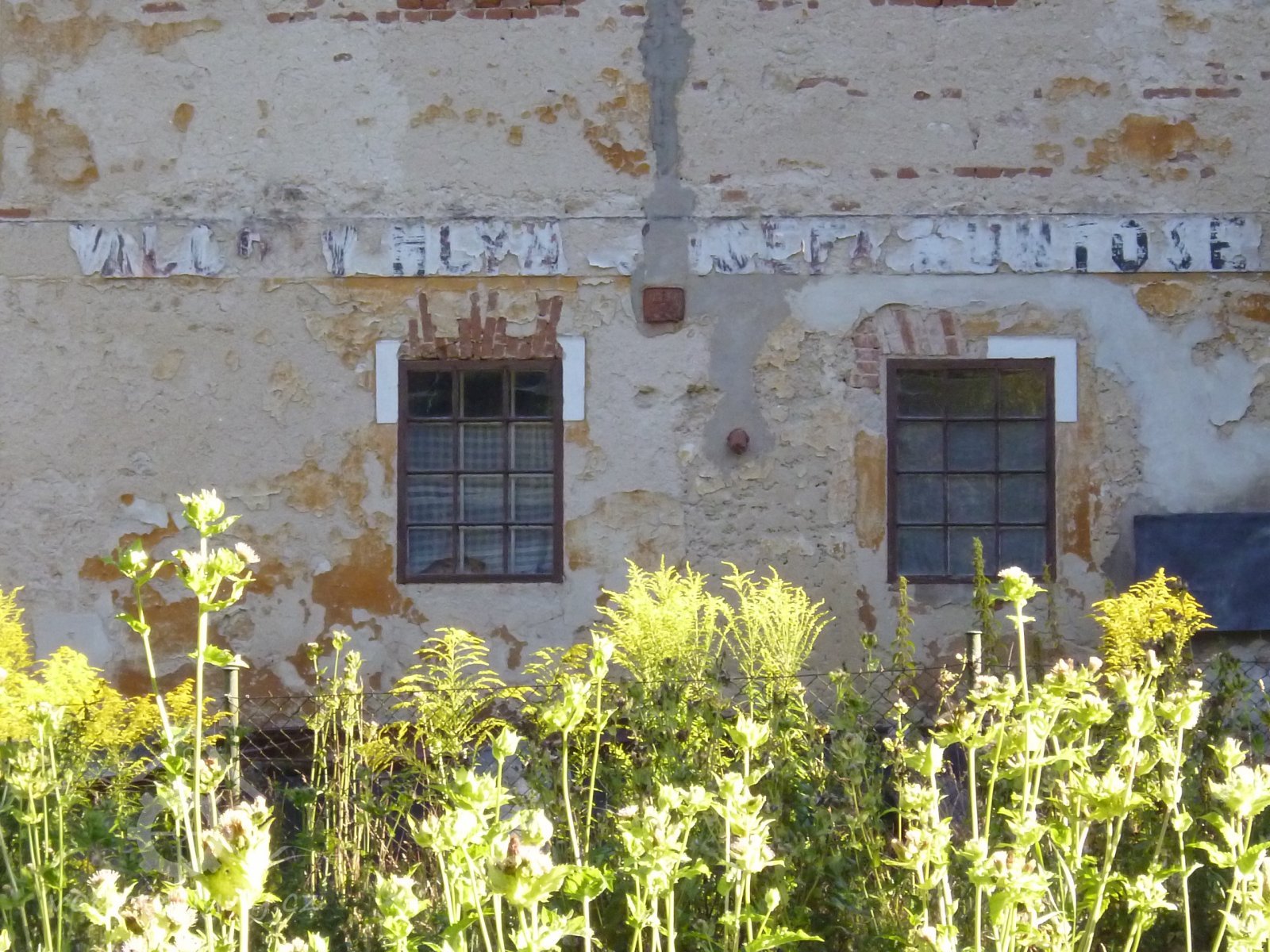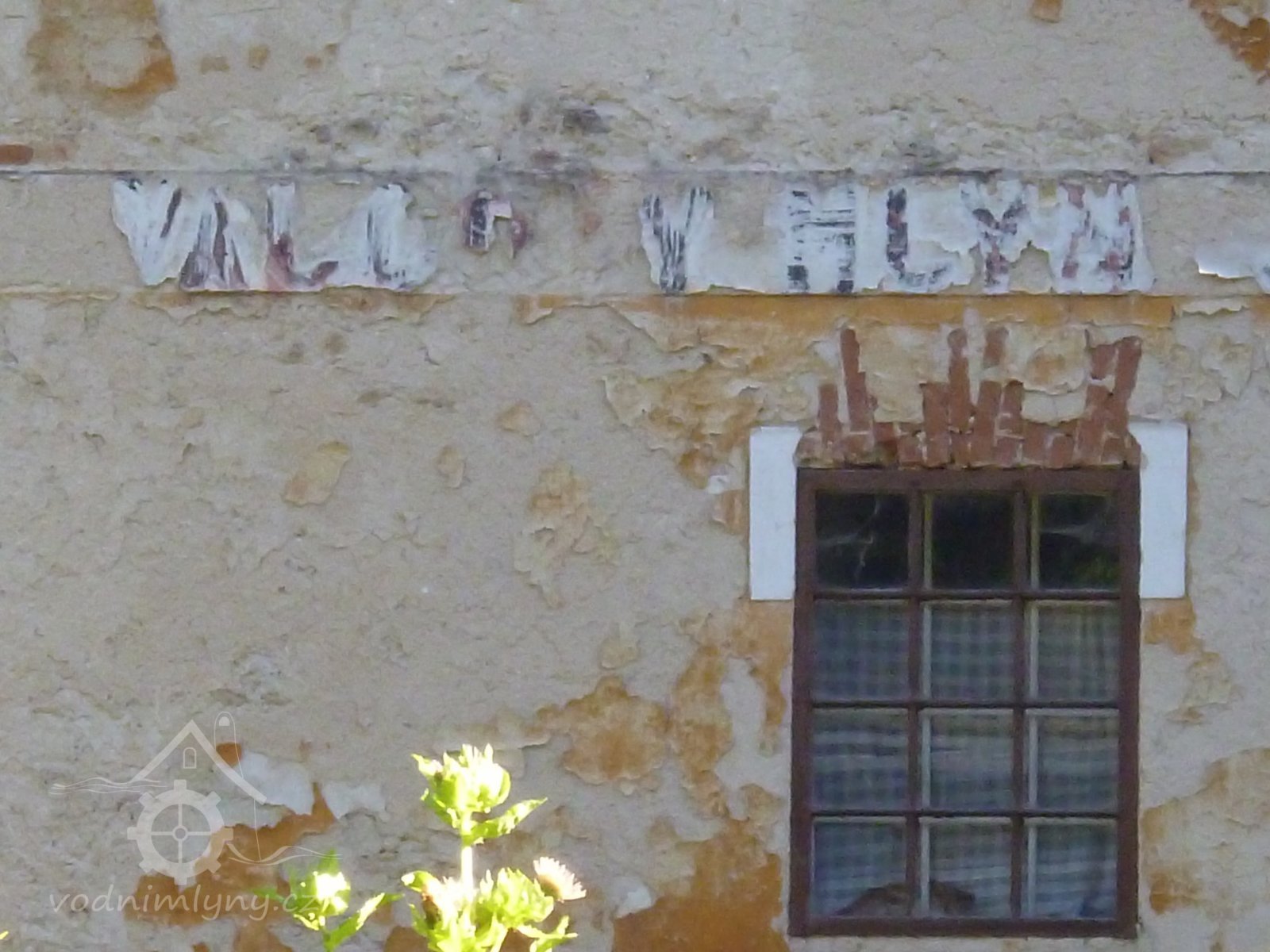 zbytky nápisu "válcový mlýn....." na budově mlýnice, okna, 2016, © Martina Havelková, (Prvky na obrázku: okno, epigrafické památky (nápisy, datování aj.))