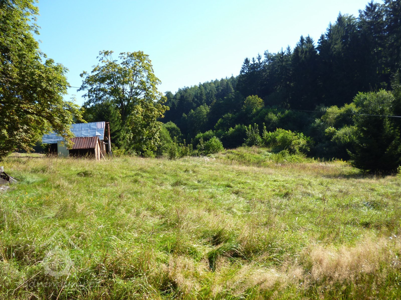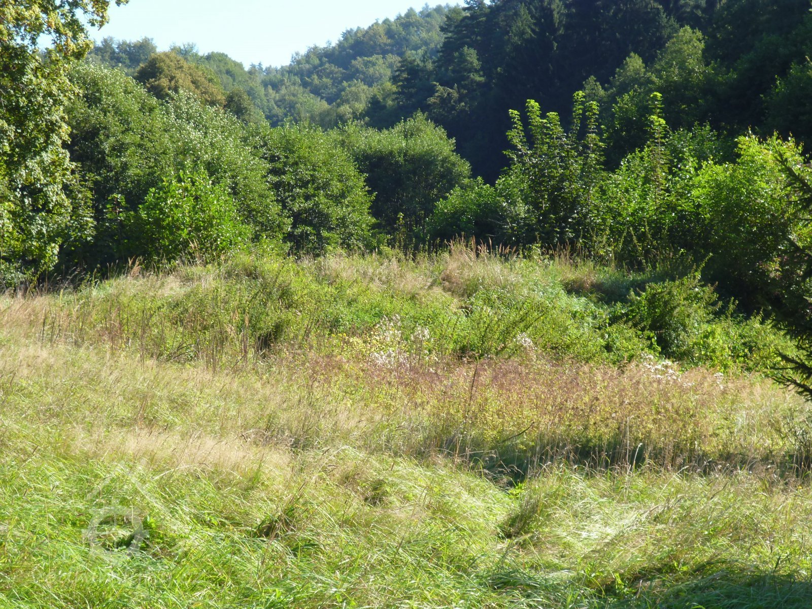 přístupová cesta z hráze, vpravo v křoví pod hrází zbytky náhonu, dle kat. mapy. tudy vedl dříve i náhon z rybníka, VIII./2016, © Kozel