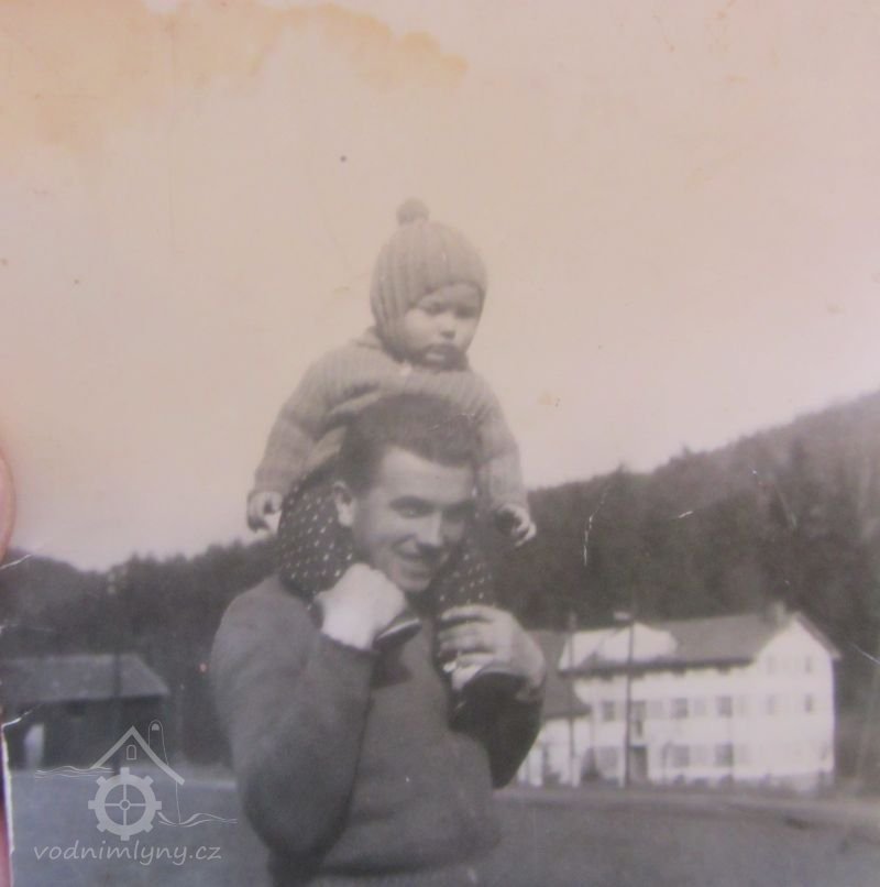 správce Hyka s mlýnem v pozadí, nedatováno, © http://informacni-stredisko-roven6.webnode.cz/vesnice/dolanky/