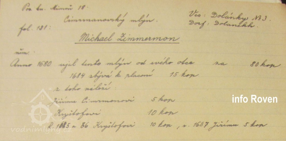 Zápis o převzetí mlýna M. Zimmermanem, nedatováno, © http://informacni-stredisko-roven6.webnode.cz/vesnice/dolanky/