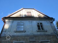 Martincův mlýn od západu, štít obytné části, okna, plastická omítka, nápis, srpen 2016, © eva48, (Prvky na obrázku: plastická omítková výzdoba fasád a štítů)