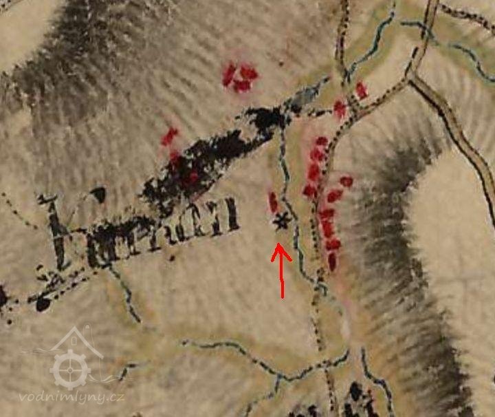 Dolní mlýn v Kokoníně, 1764-68, © I.vojenské mapování, výřez, oldmaps.geolab.cz