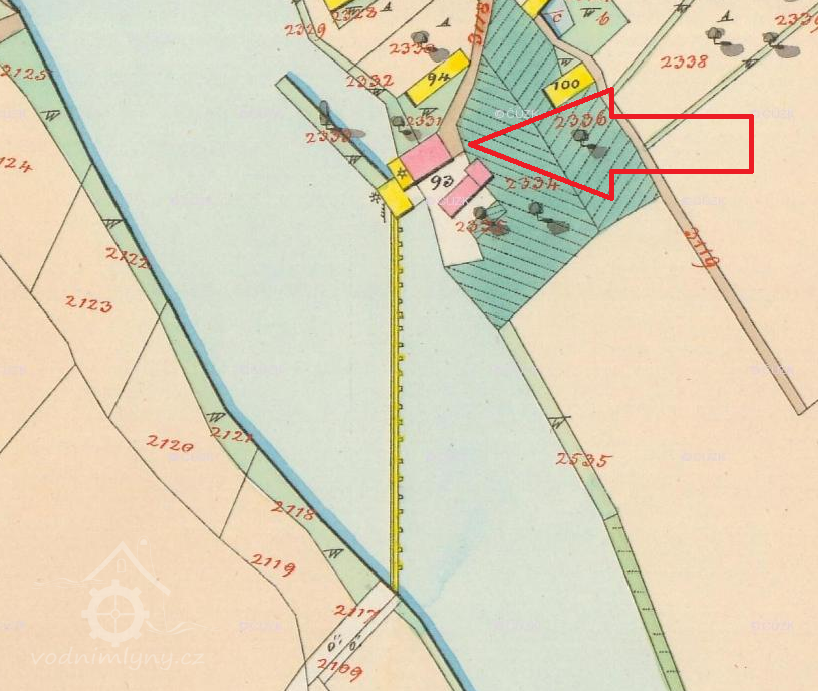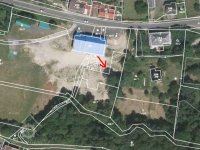 Letecké snímkování a katastrální mapa-modrá je střecha budovy HSA, pod ním jihovýchodně stál mlýn, 2010, © kontaminace.cenia.cz