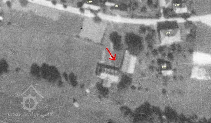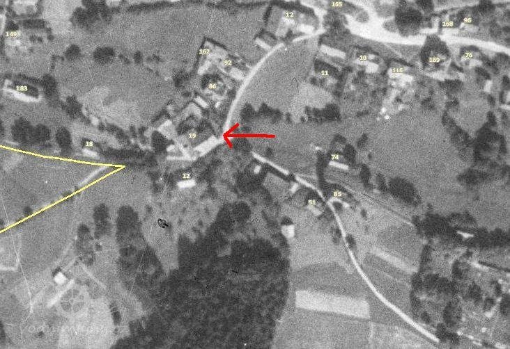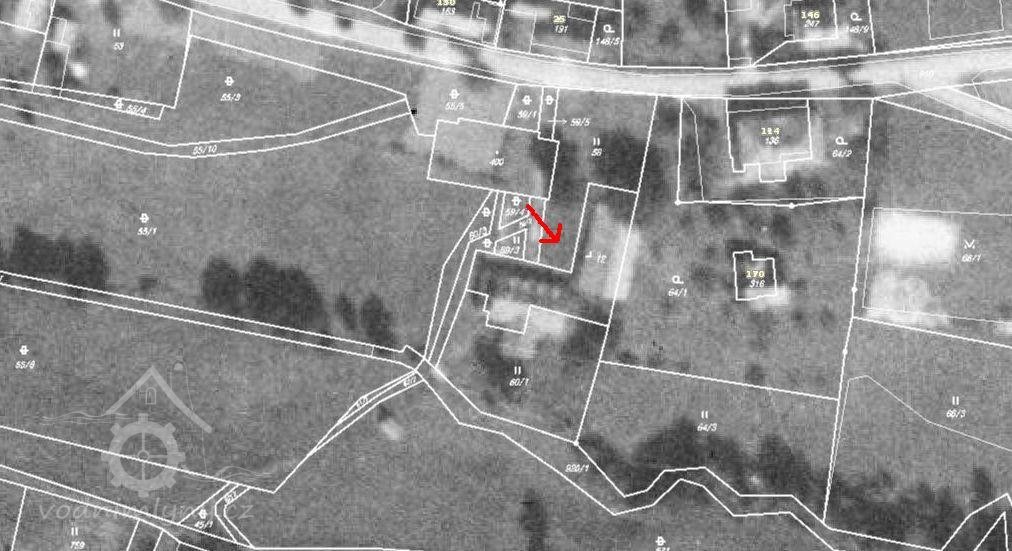Letecké snímkování a katastrální mapa-budova čp.20 ještě stála, 1953, © kontaminace.cenia.cz