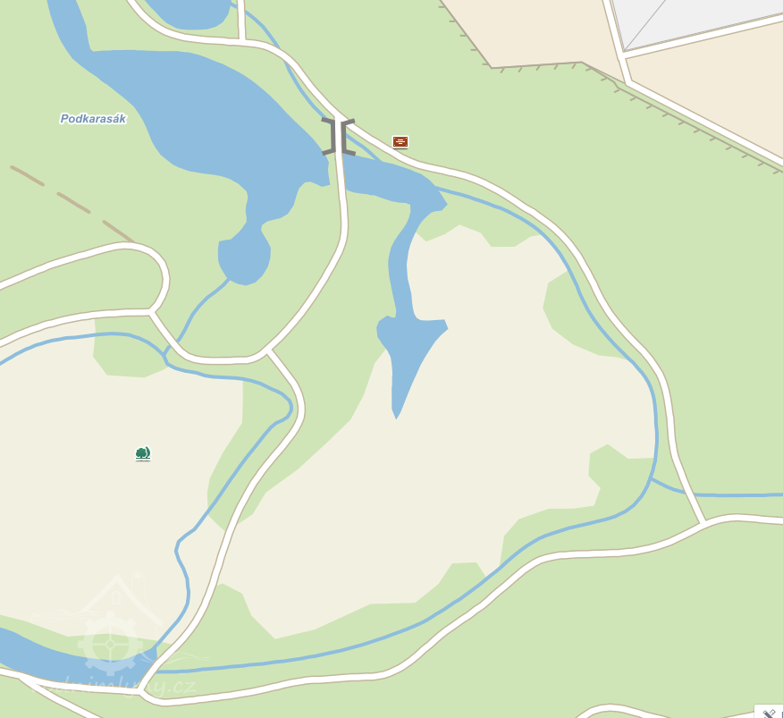 Porovnání historické a současné mapy ukazuje, jak byl mlýnský náhon využit pro zbudování rybníka Podkarasáku., 2016, © mapy.cz