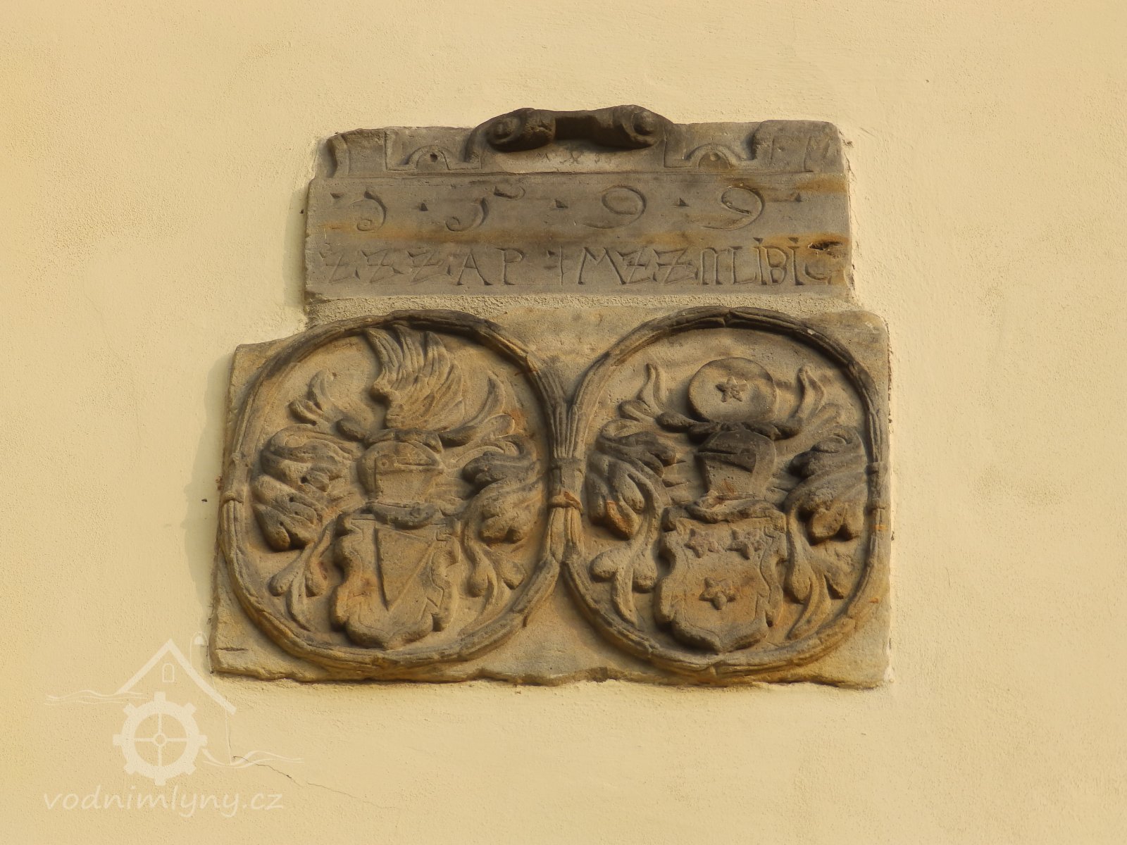 Deska s letopočtem 1599 a erby Zikmunda Zapského ze Zap a jeho manželky Markéty Zapské ze Šlivic, údajně z bývalého mlýna., 2016, © doxa