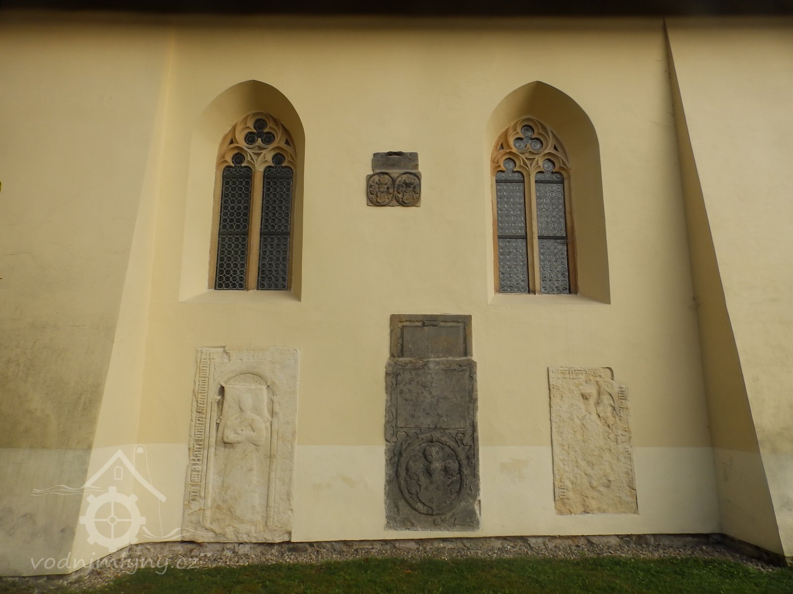 Boční strana kostela Narození Panny Marie v Průhonicích se zazděnými náhrobníky (deska z mlýna je mezi okny), 2016, © doxa