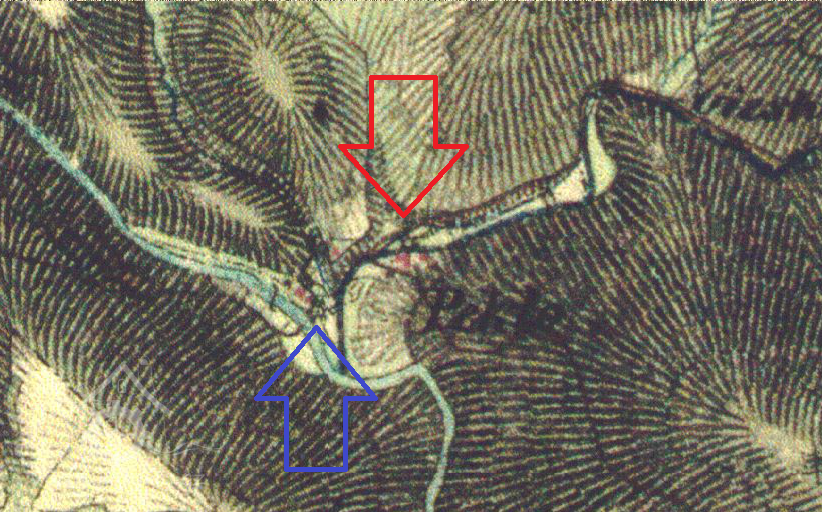 Mlýny Peklo I. (jestřebský, červeně) a Peklo II. (lipský, modře), I. vojenské mapování, výřez, 1764 - 68, © oldmaps.geolab.cz