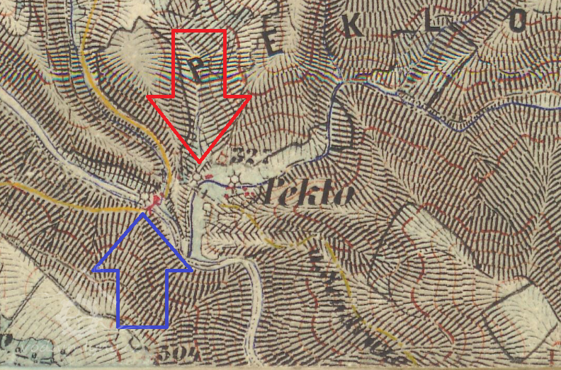 Mlýny Peklo I. (jestřebský, červeně) a Peklo II. (lipský, modře), III. vojenské mapování, výřez, 1877 - 80, © oldmaps.geolab.cz