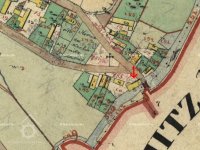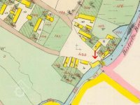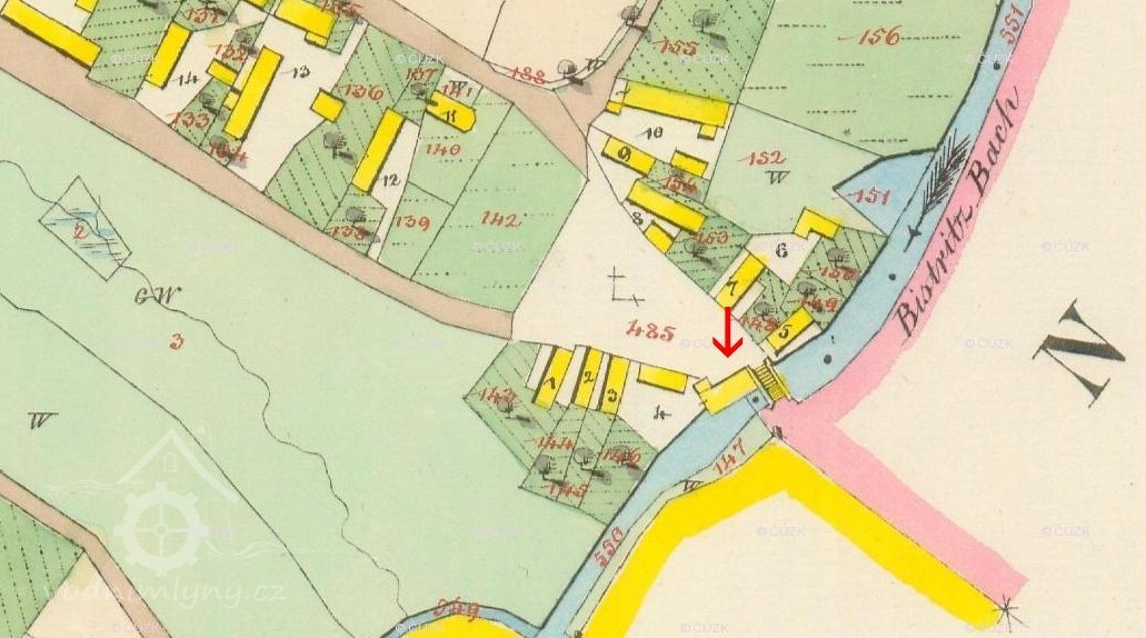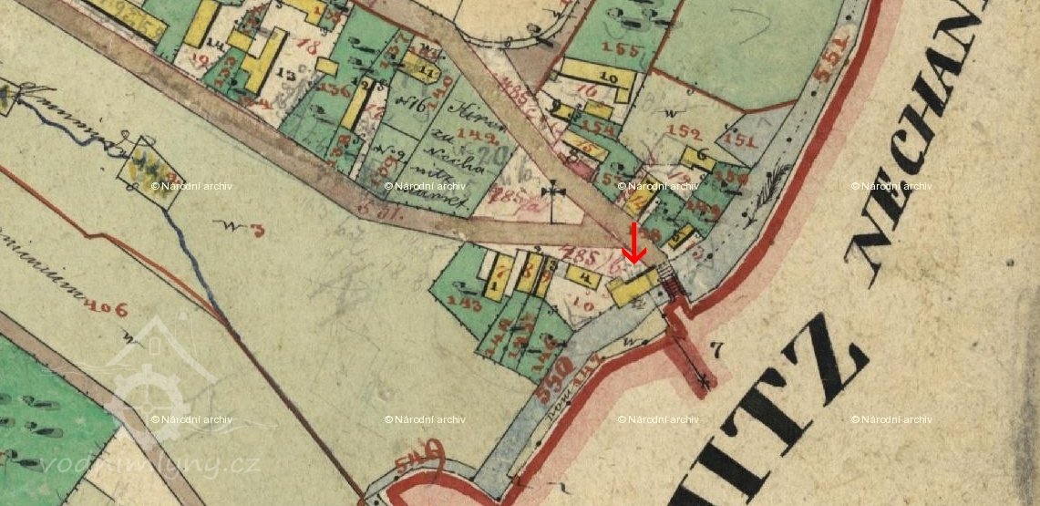 Ještě za mlynáře Antonína Fiedlera náležela k mlýnu louka mezi mlýnem a jezerem u mostu, jež se stala posléze jádrem sporu mezi mlynářem a velkostatkem. Dlouhotrvající spor nahněval vlastníka mlýna tak, že ještě před jeho ukončením nemovitost raději prodal. Krátce po prodeji mu však přišla zpráva, že spor vyhrál. Ze zlosti nad tím vším roztrhal a spálil veškeré listiny a doklady o mlýnu i onom sporu, které u sebe měl. Rozmístění jednotlivých budov v areálu mlýna se nám dochovalo v indikační skice stabilního katastru z roku 1841, kterou vyhotovil adjunkt 2. třídy Ernest Köstner a geometr 3. třídy Anton Wind.